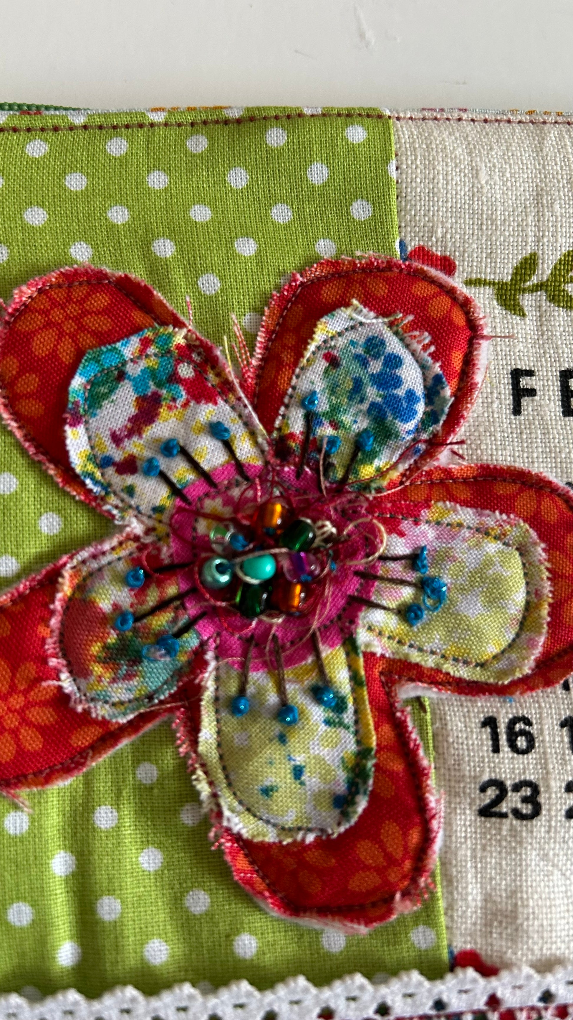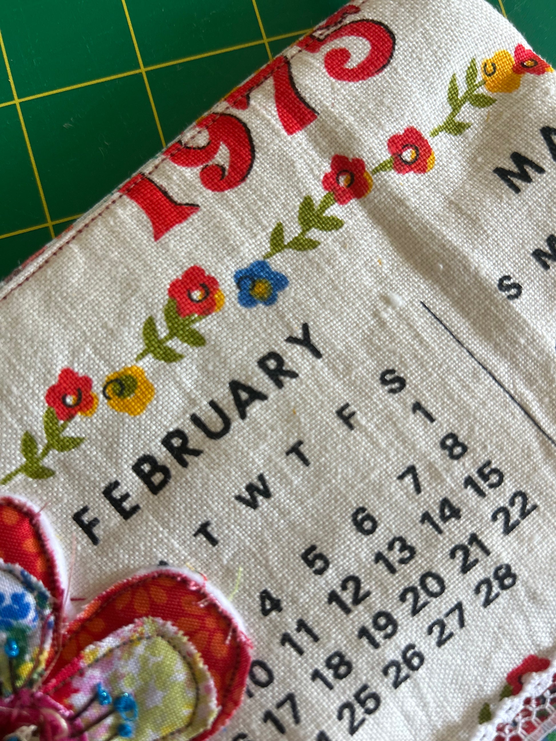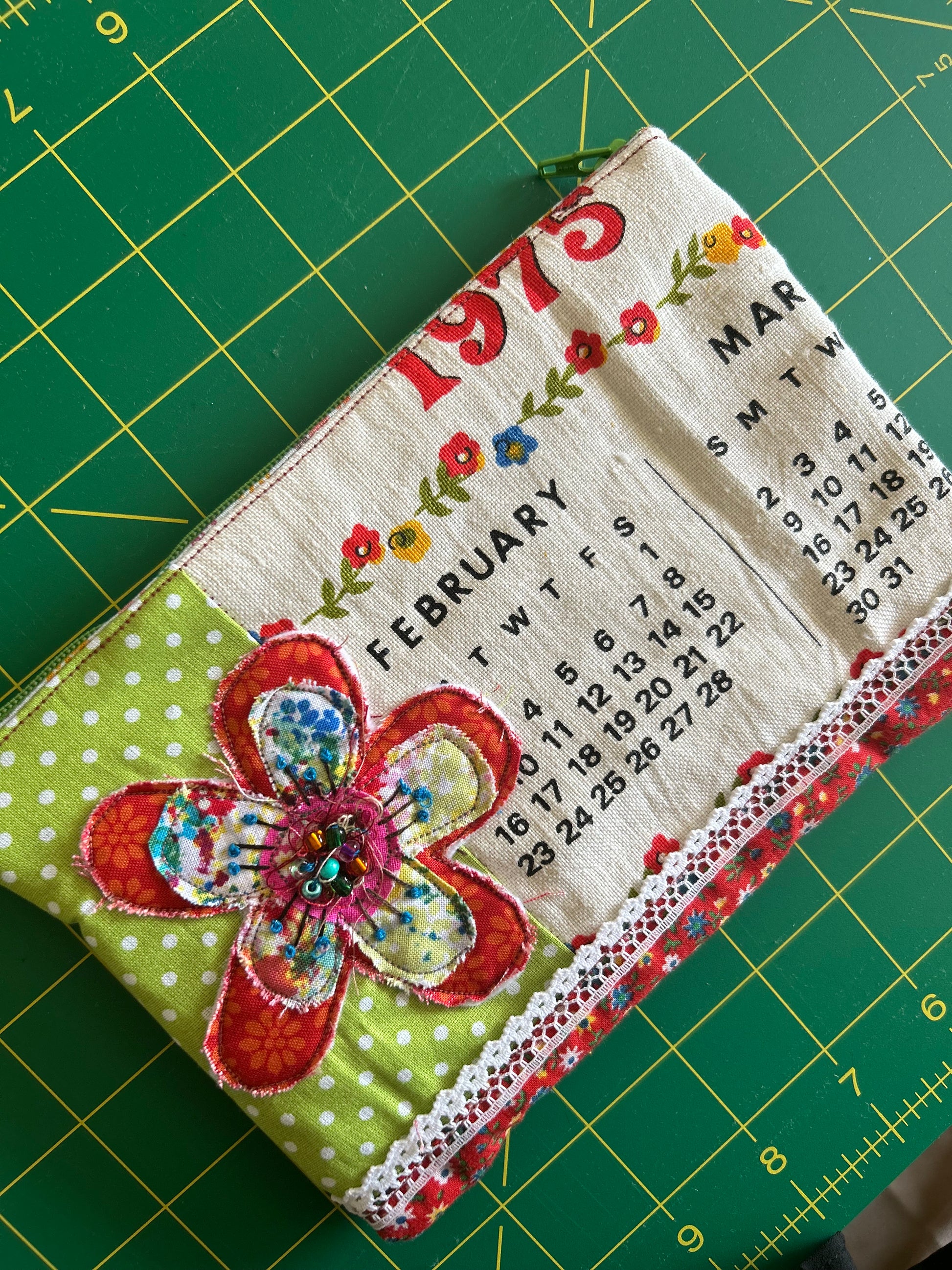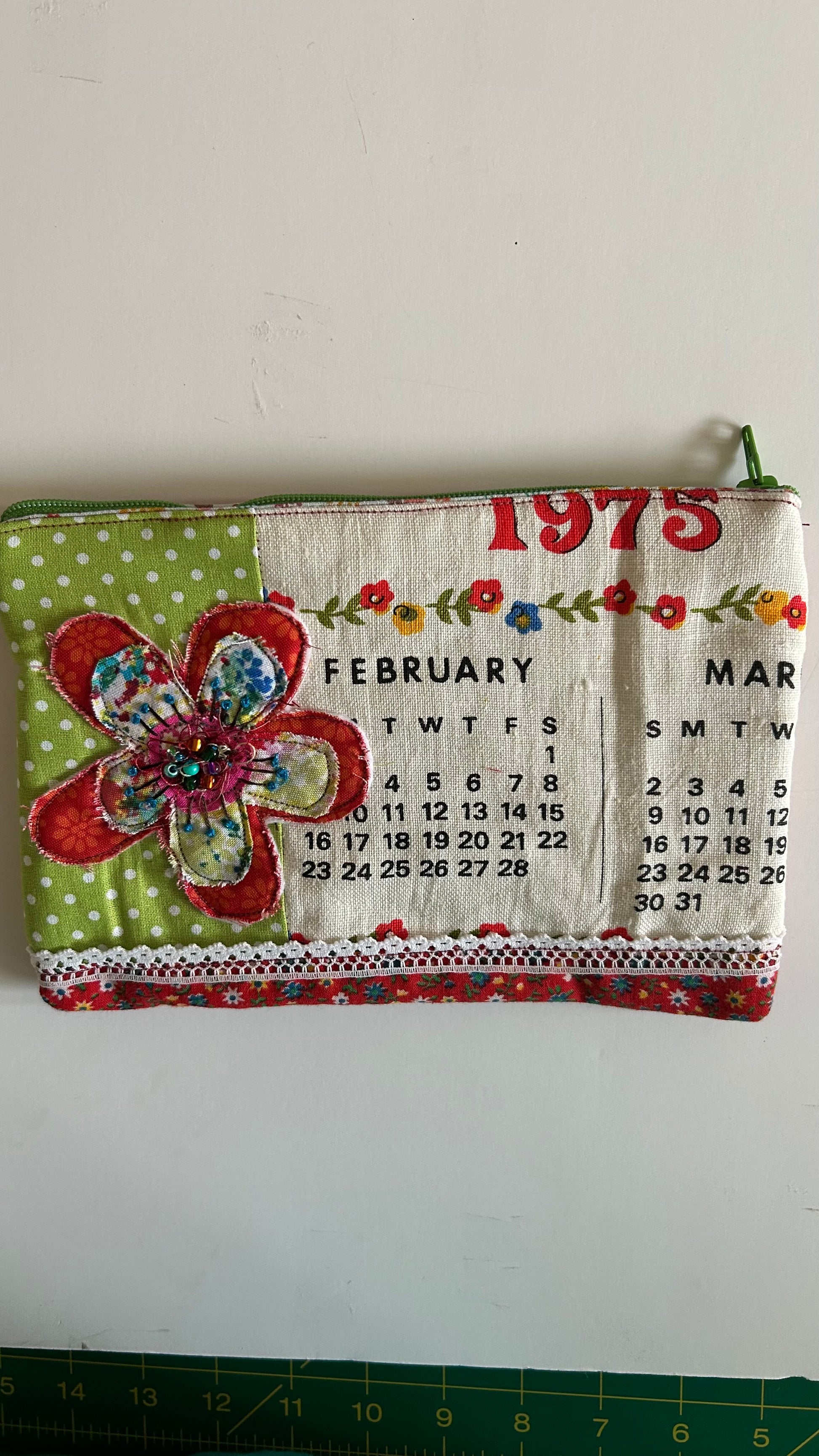 Description : This is my adorable 1975 vintage linen calendar zipper pouch. February and part of March are featured on the front side with a sweet lime green polkadot fabric. I accented the front with a slow stitched daisy made of fabrics from my stash. This daisy has stitches, French knots, and beads in the center. A piece of vintage lace accents the bottom of the front side. On the back side I used my vintage red calico fabric. It is the perfect size for cosmetics, or can be used as an art pouch. This pouch has a lime green zipper and inside features a sweet light blue calico print this pouch is Fully lined and the year 1975 is featured at the top. This would make a perfect gift for someone turning 50 this year . It is one of a kind there won’t be another like it so grab it today.