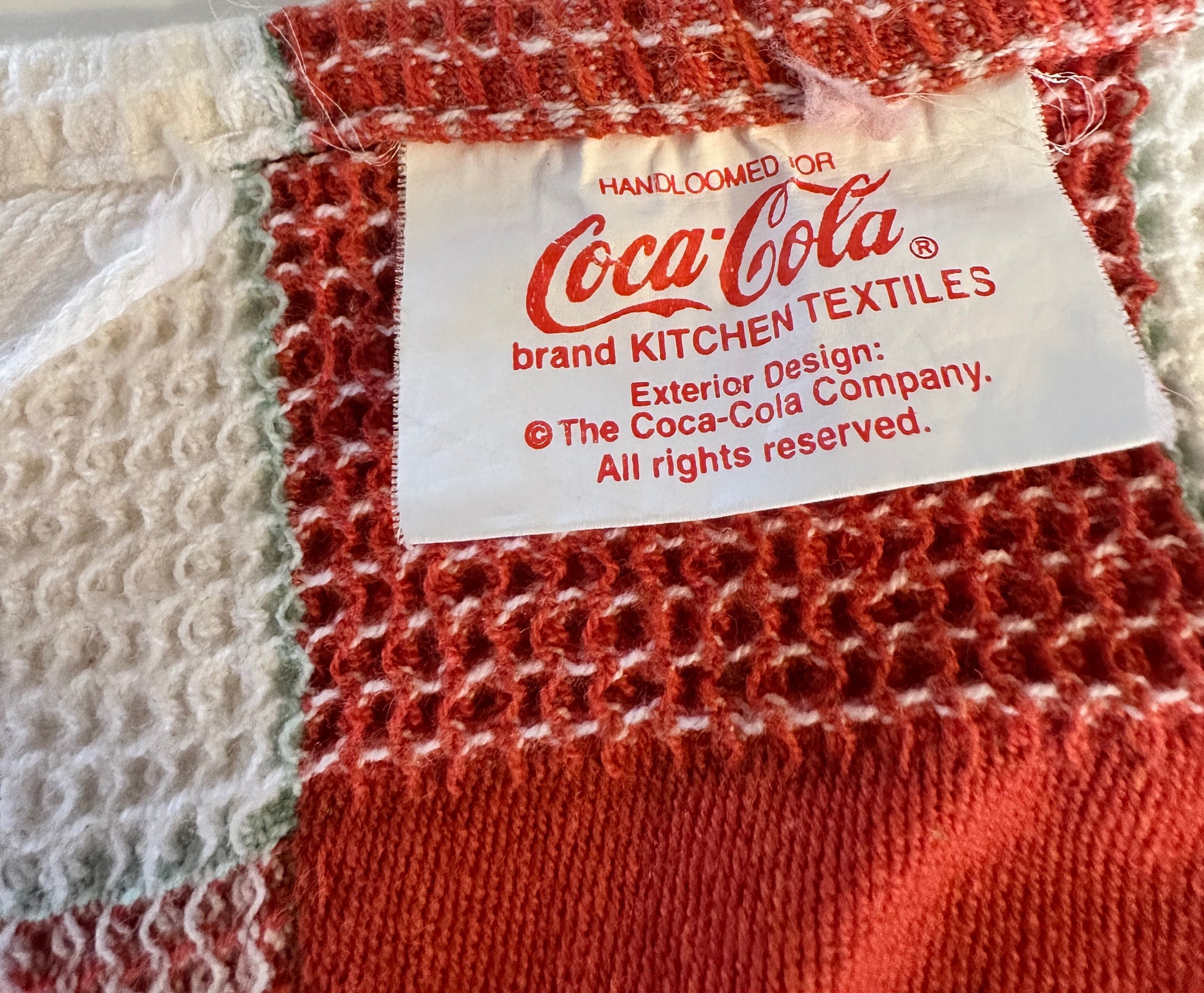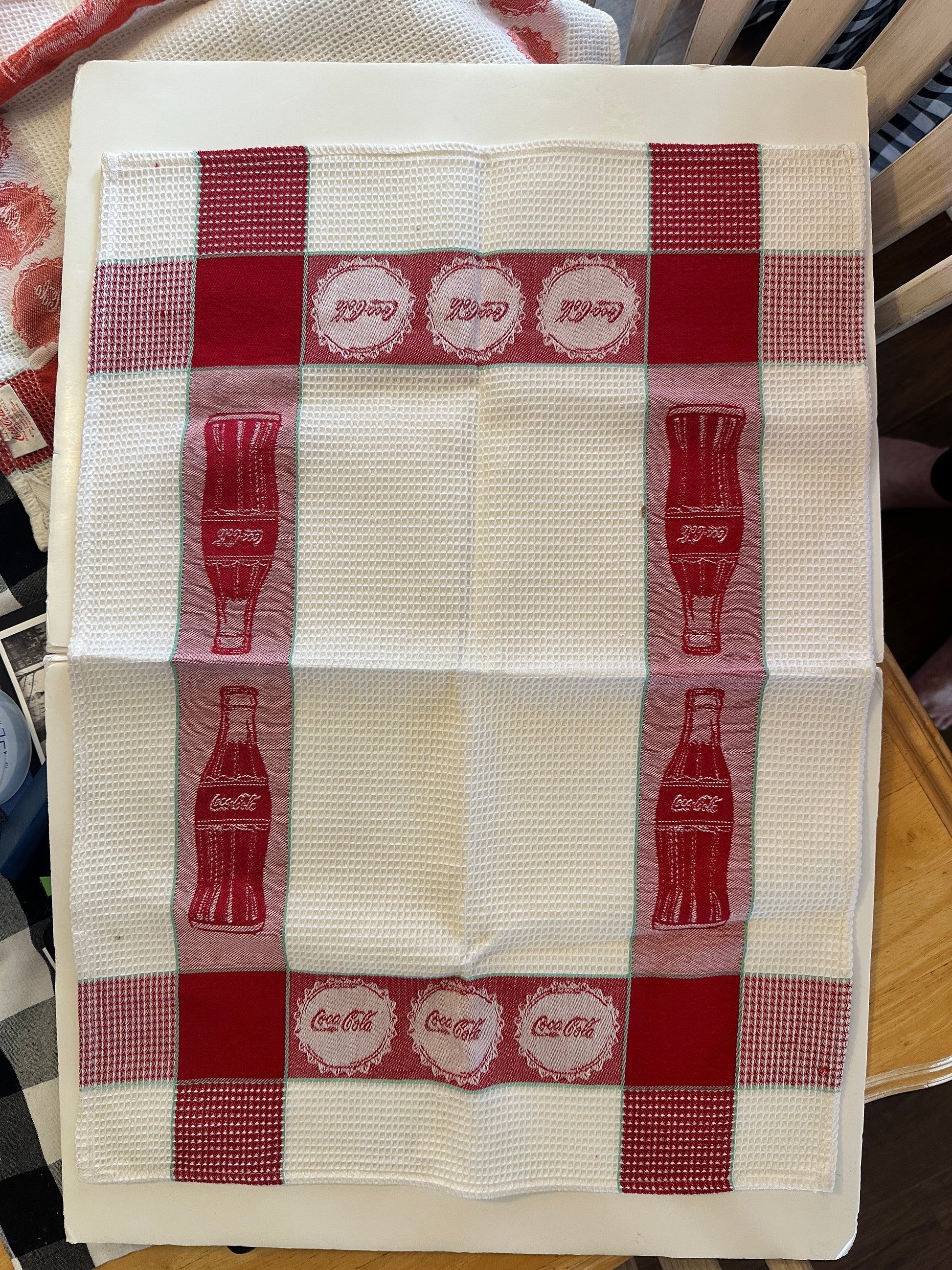 Description : Crafted with care, these two handloomed dish towels showcase the iconic Coca-Cola brand, enveloped in a classic red and white color scheme. 100% Cotton. The waffle weave design brings a touch of texture and absorption to your kitchen arsenal, making these towels as functional as they are stylish. Originating from India, these towels are a testament to skilled craftsmanship, merging the timeless appeal of Coca-Cola with a contemporary Park Design. Whether you're wiping up spills or drying off glasses, these towels add a pop of retro flair to your daily routine. 1 Towel is NWT measures 18 X 26 inches.The other has been washed and shrunk to 16 X 22 inches