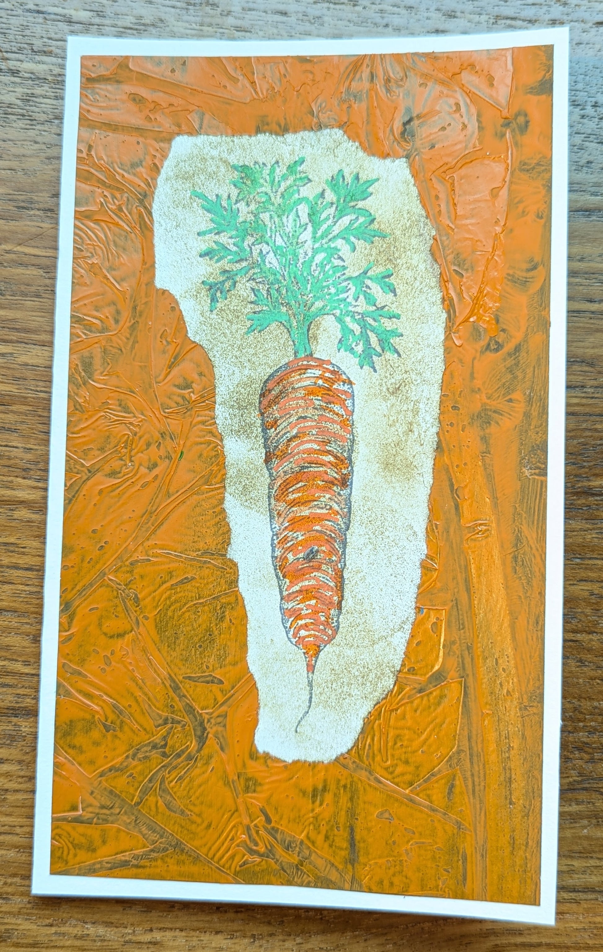 Description : The heavily textured and very orange background of this card shows off the stamped and colored carrot on distressed paper. This is an original creation (not a print), is blank inside for your own message, maybe to a gardener friend, and the envelope shown is included for mailing.
