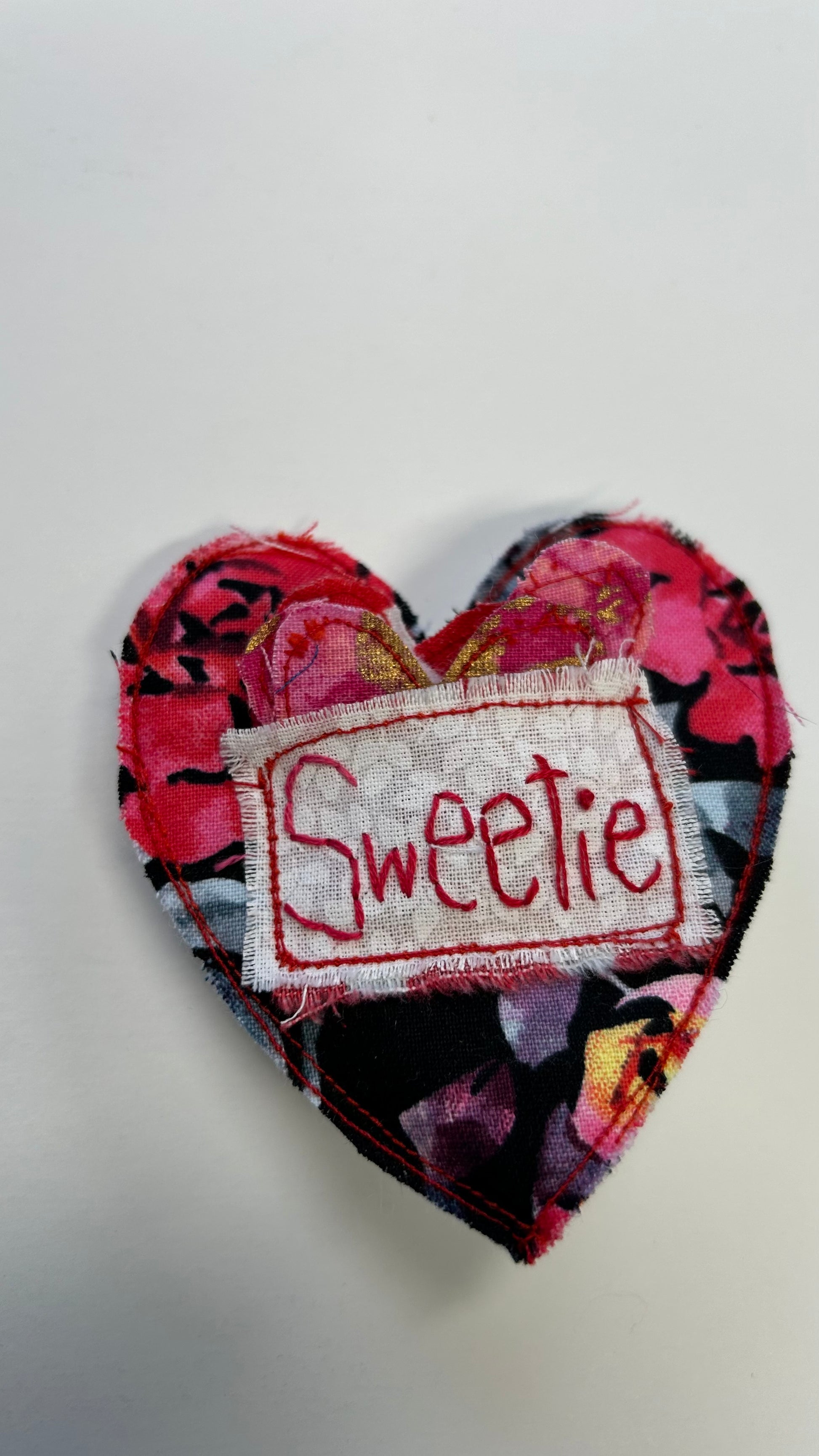 Description : This is an adorable heart pin that has a super sweet hand stitched pocket stuffed with 3 additional little mini hearts. The pin is felt backed with an easy to use pin on the backside perfect for your jean jacket, bag or sweater. Keep the pocket stuffed with the mini hearts or give them away one a time & brighten someone’s day. It is after all the perfect conversation starter -heart. Sweetie is hand stitched in bright red. I hope you enjoy this unique one of a kind pin that is sure to brighten cold February days ahead!