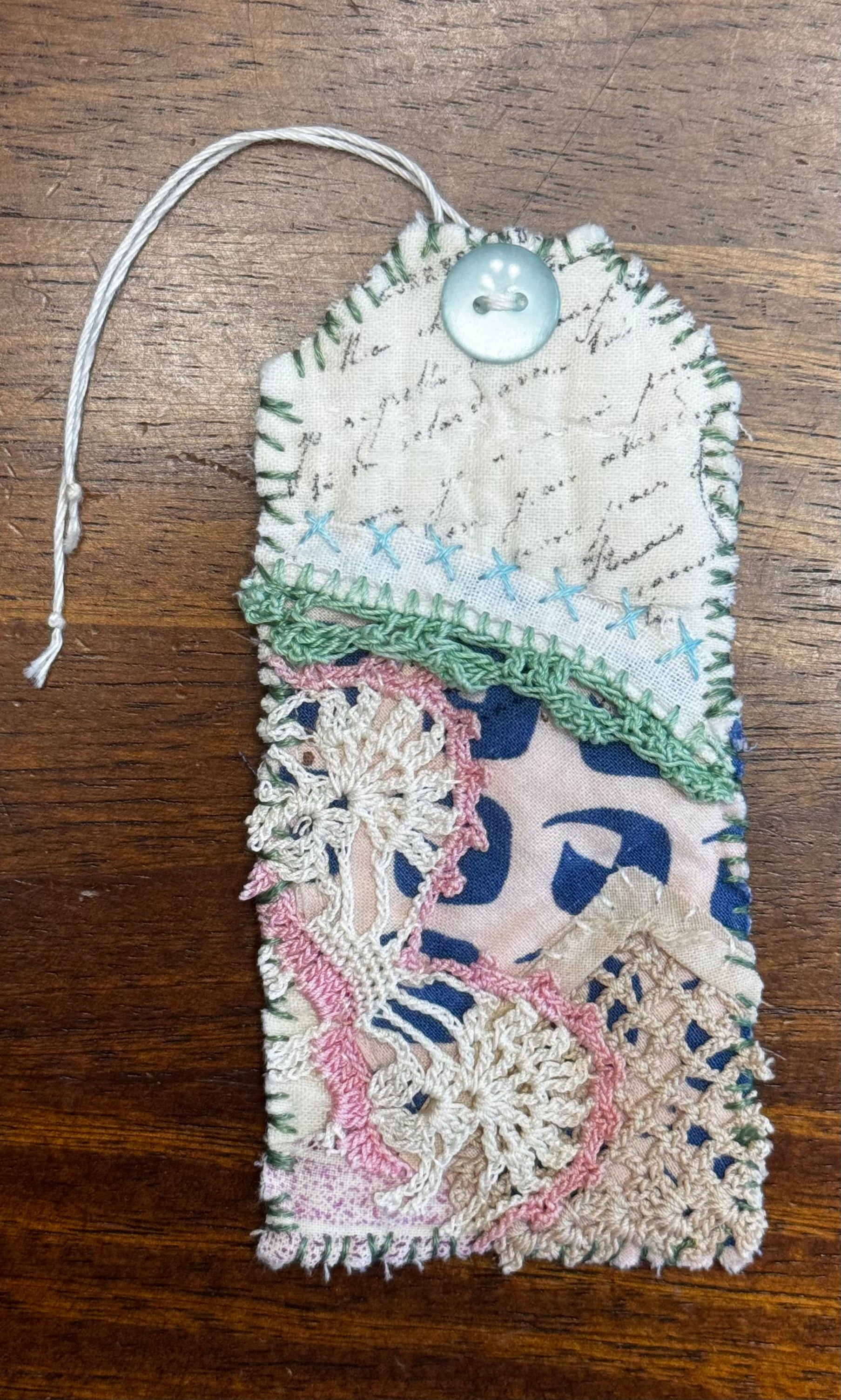 Description : Slow stitched with an old quilt, beautiful materials and antique lace and embellished with DMC embroidery floss and a button. This tag can be used for a journal cover, use to embellish a name tag, glue a magnet to the back and display on your refrigerator or use a safety pin and attach to your clothing. Using your imagination there are endless uses! This listing is for the tag only, everything else are props.