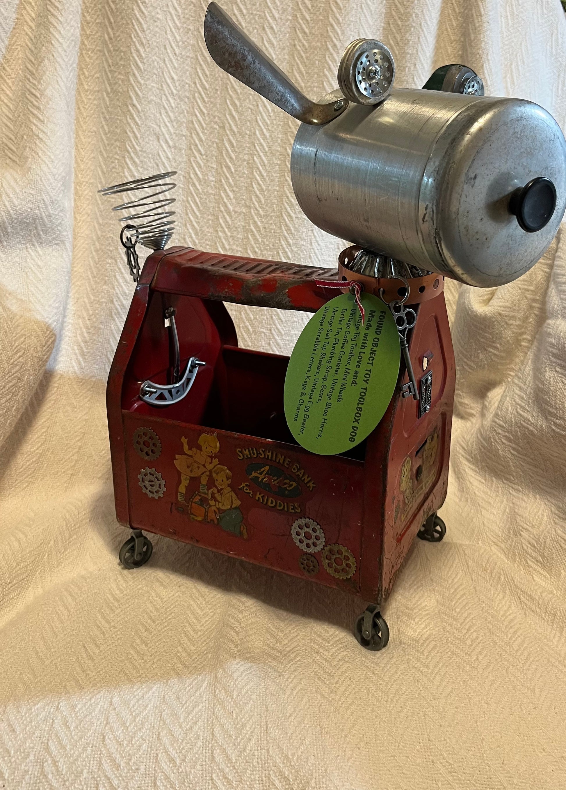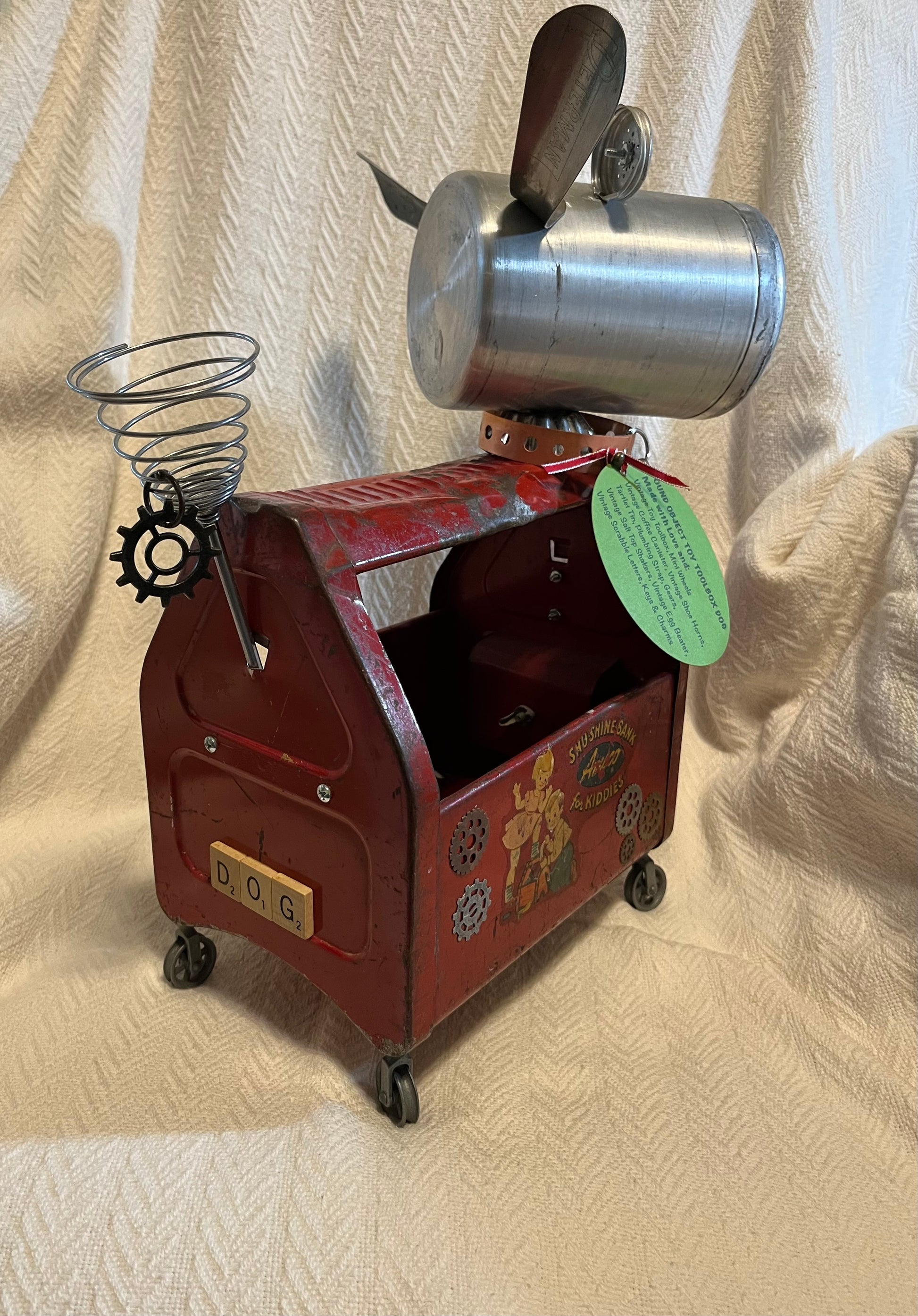 Description : A vintage toy tool box turned into a scrappy dog made with other found objects. A coffee canister for the head with added shoe horns for ears. Salt shaker tops for eyes. Plumbing straps, gears, egg beater, mini pulley wheels, scrabble tiles, keys, &charms to finish out this fun fella. Perfect for any dog lover.