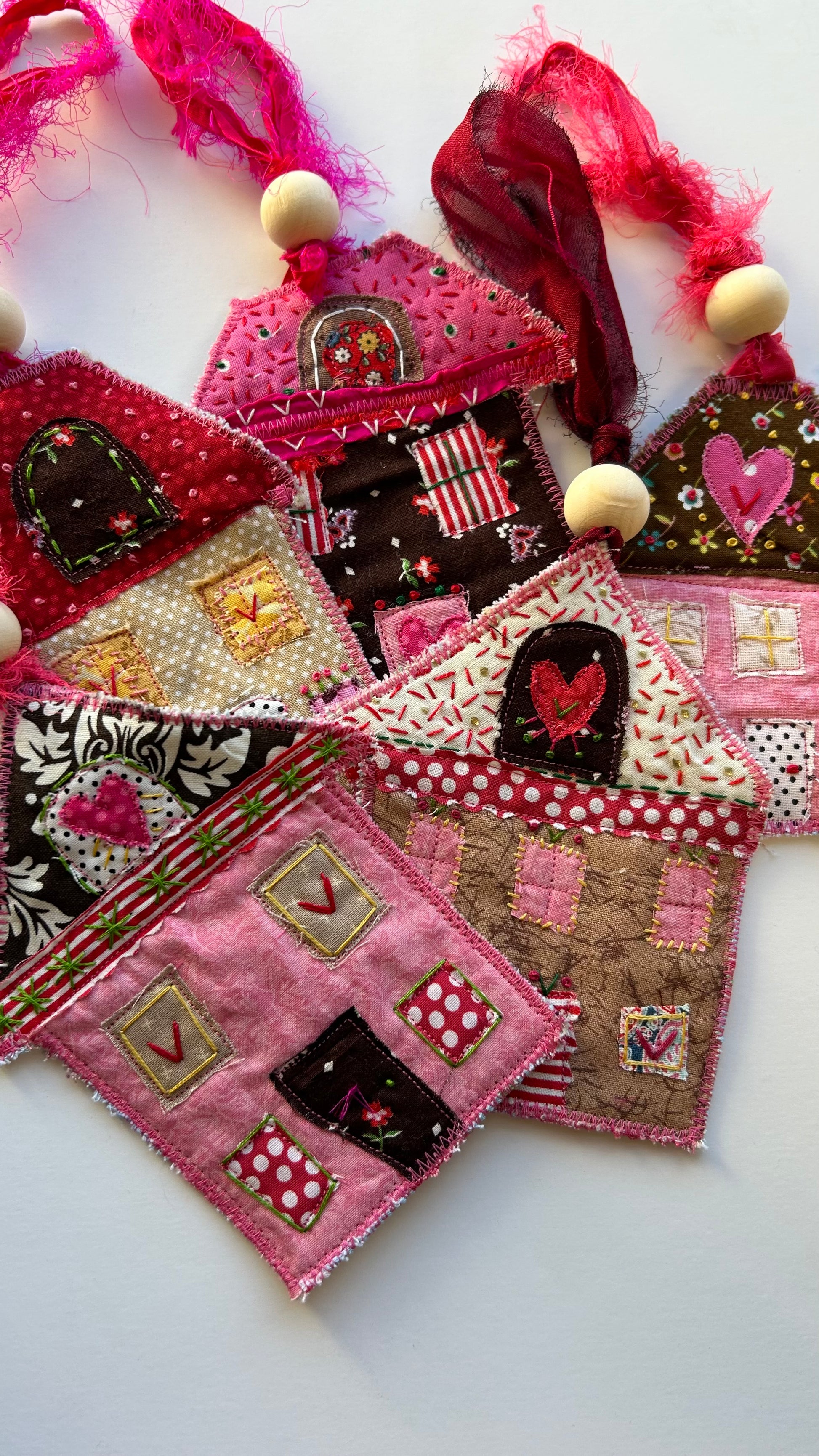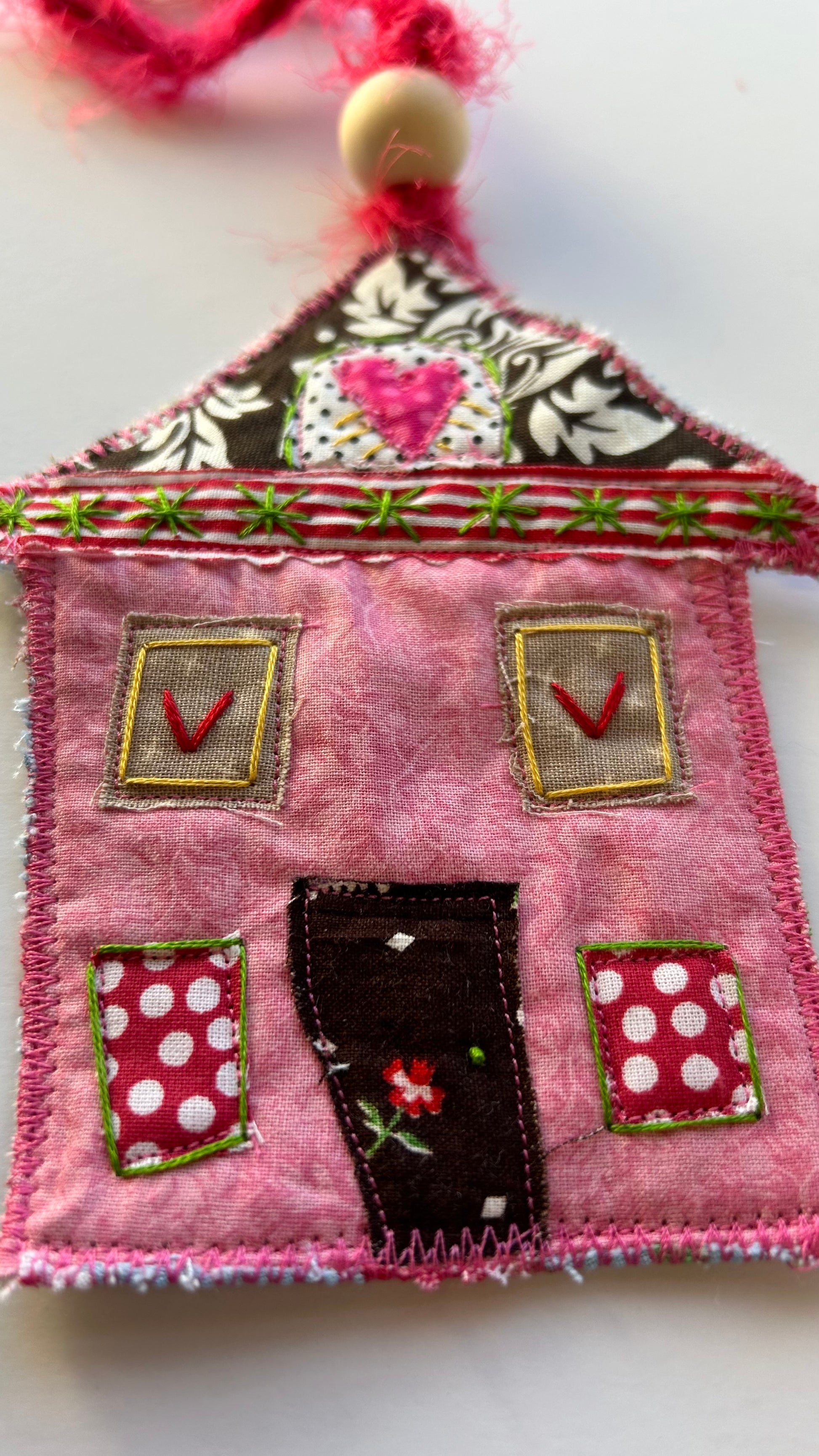 Description : Gingerbread House Ornament This is my twist on the ever popular gingerbread houses. I fabric collaged and slow stitched these sweet little creations making each one a unique one of a kind piece for your tree. Each one is topped with a natural wood bead & hangs from a bright sari ribbon. In the windows and on the door & roof of each of these houses you will find hand stitched hearts, dashes and decorations to make every house extra special. Grab one or more than one for yourself, decorate your tree or use them at package toppers for gift giving! You will receive the house in the first picture shown.