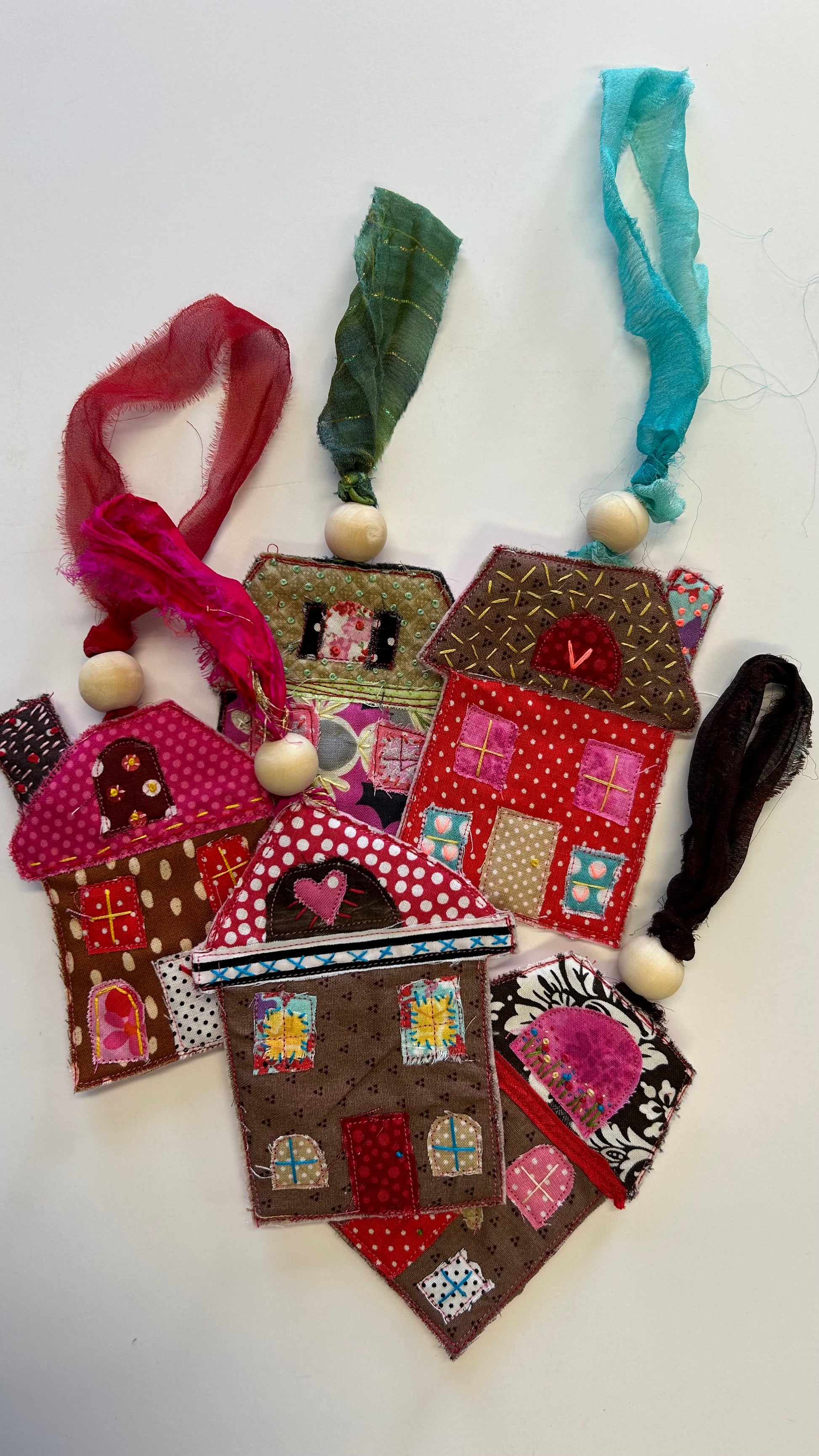Description : Gingerbread House Ornament Gingerbread House Ornament This is my twist on the ever popular gingerbread houses. I fabric collaged and slow stitched these sweet little creations making each one a unique one of a kind piece for your tree. Each one is topped with a natural wood bead & hangs from a bright sari ribbon. In the windows and on the door & roof of each of these houses you will find hand stitched hearts, dashes and decorations to make every house extra special. Grab one or more than one for yourself, decorate your tree or use them at package toppers for gift giving! You will receive the house in the first picture shown.