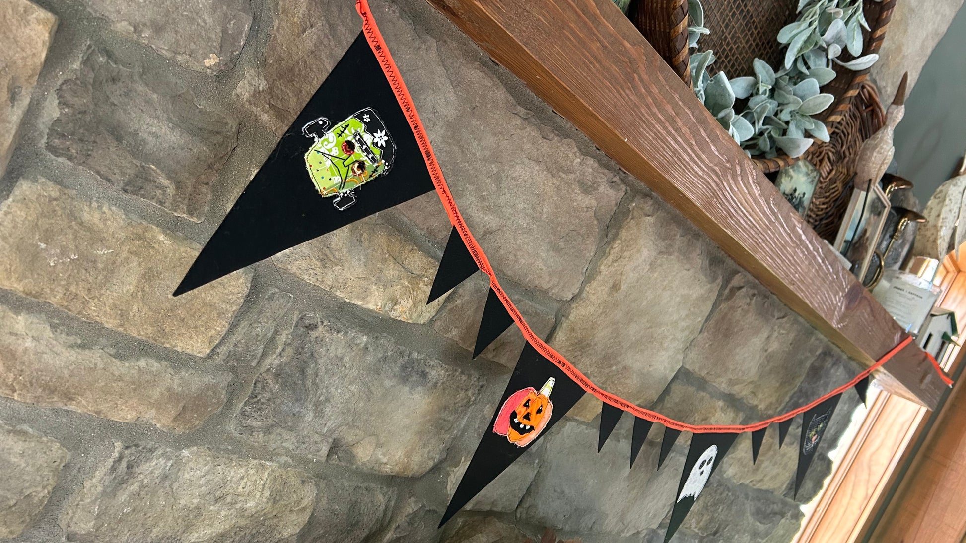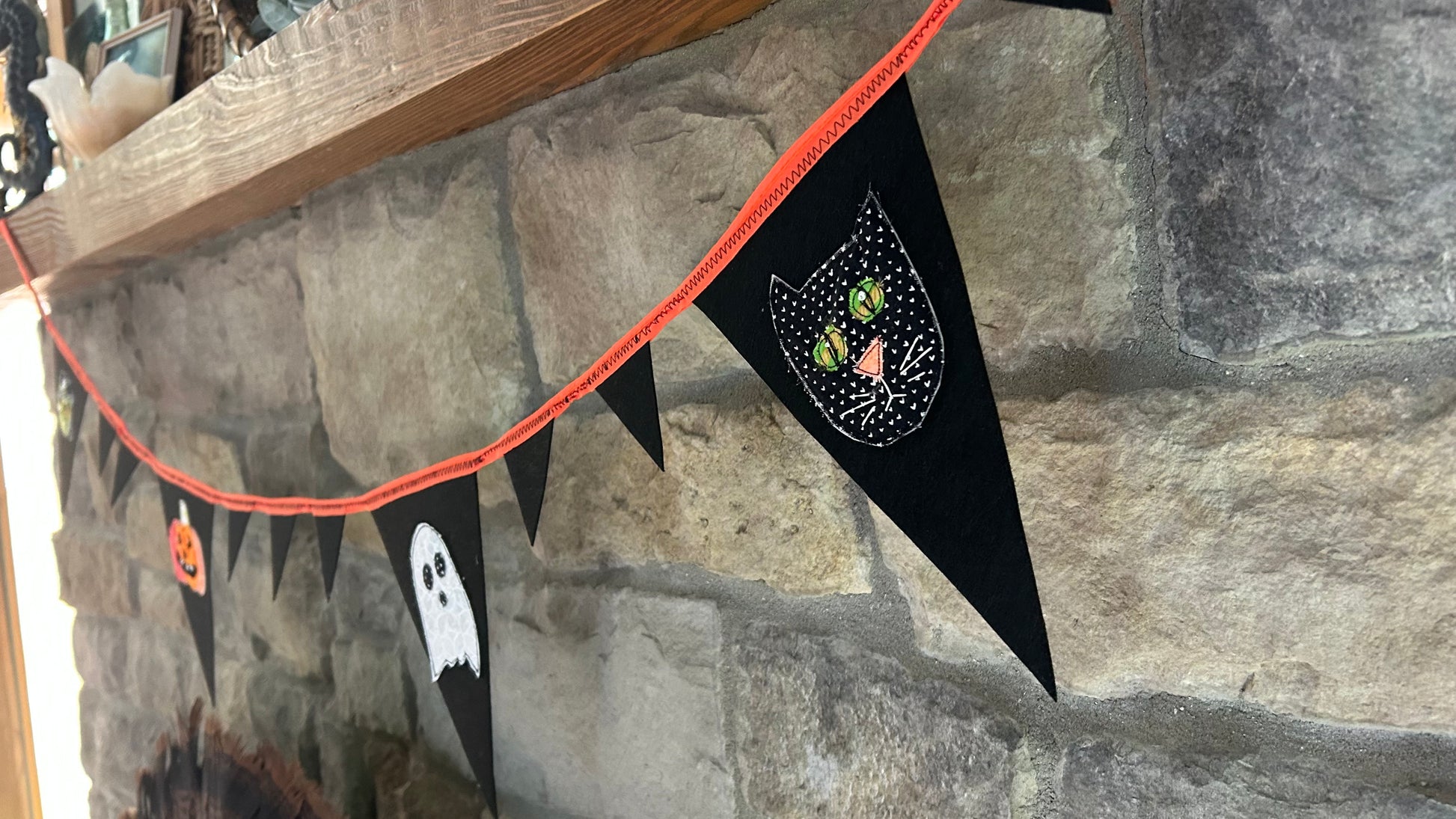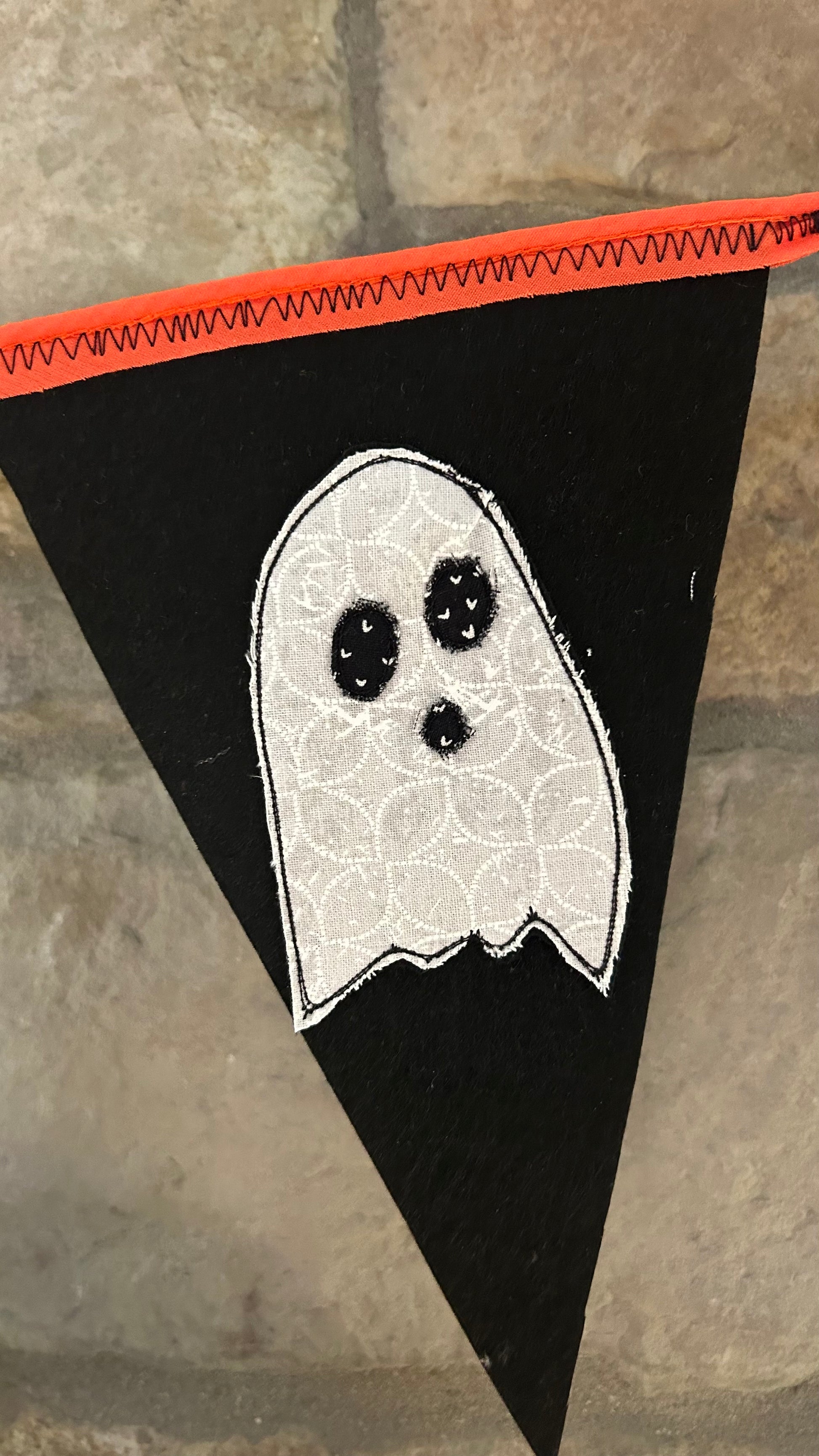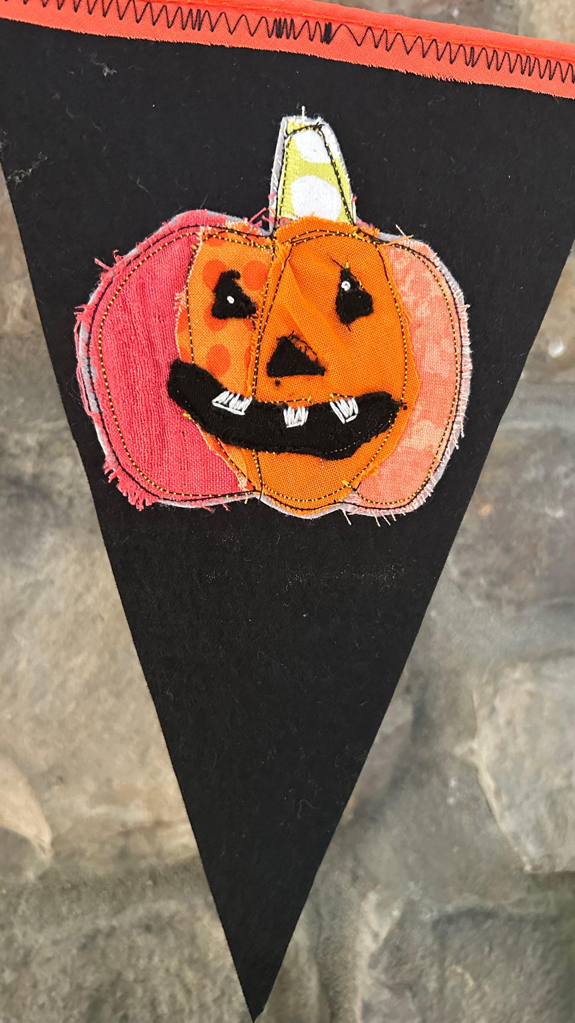 Description : This is my adorable Halloween banner made with four special slow stitched creations. Your banner will includ one Frankenstein, one Jack o lantern, one ghost,& one black cat! All these are machine stitched onto black felt pennants. Tiny black felt pennants are spaced in between each of the featured characters. It is topped off with an orange topper. Grab this today & as it to your fall decorating. As with all of my creations they are one of a kind, whimsical, and a bit quirky! None are perfect & that makes them the best!