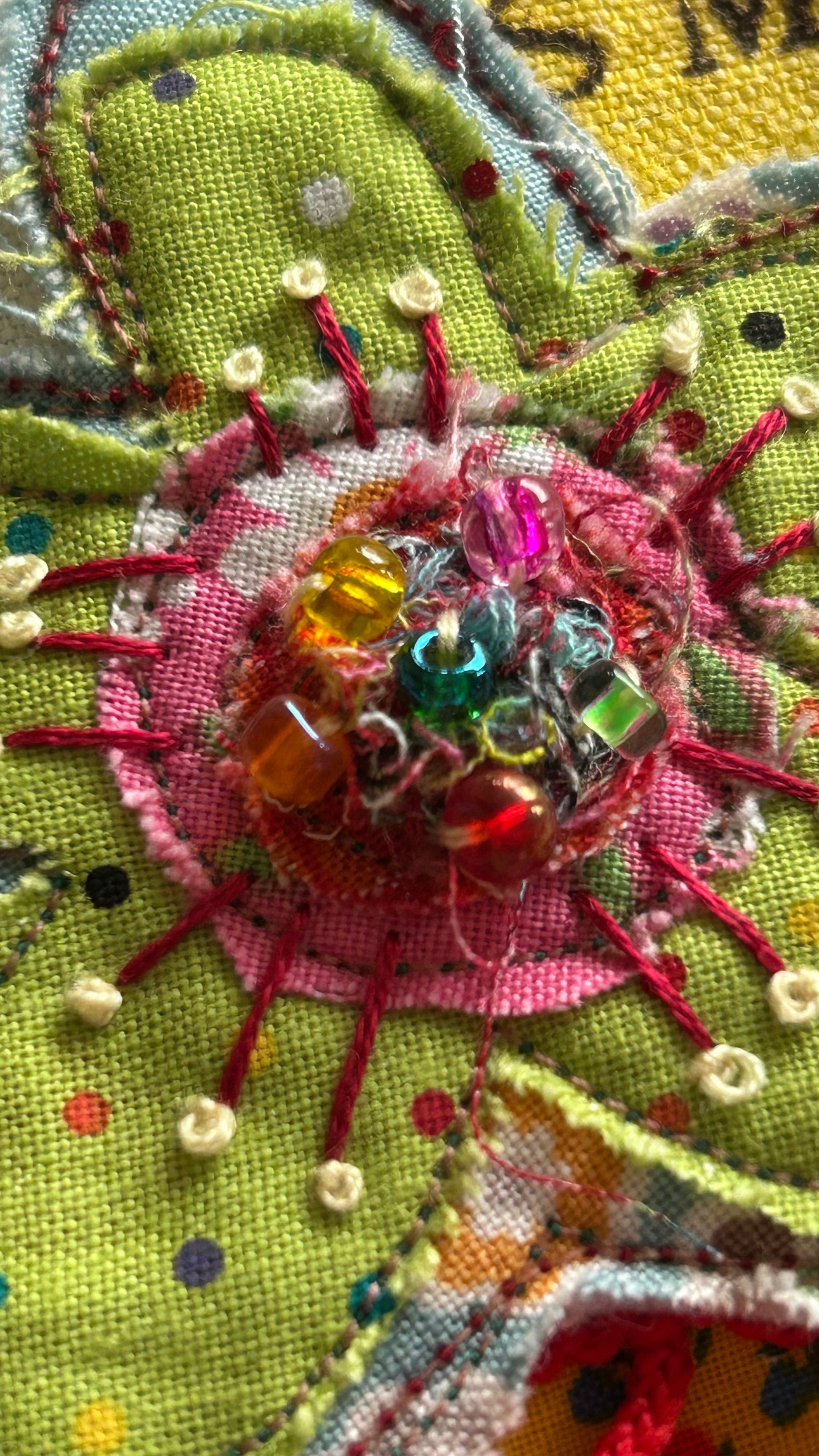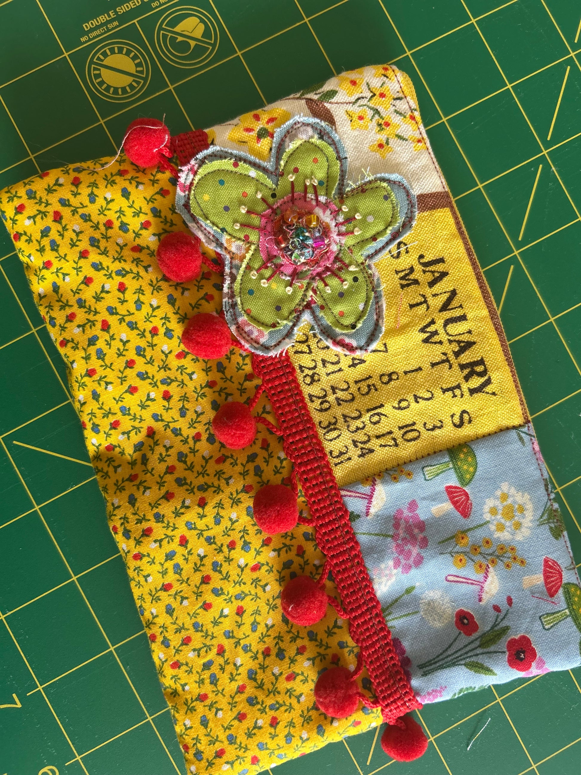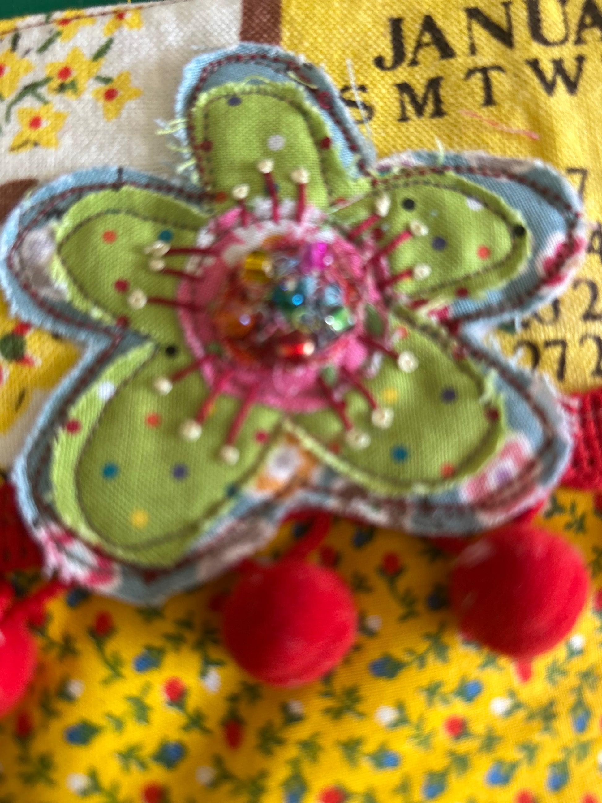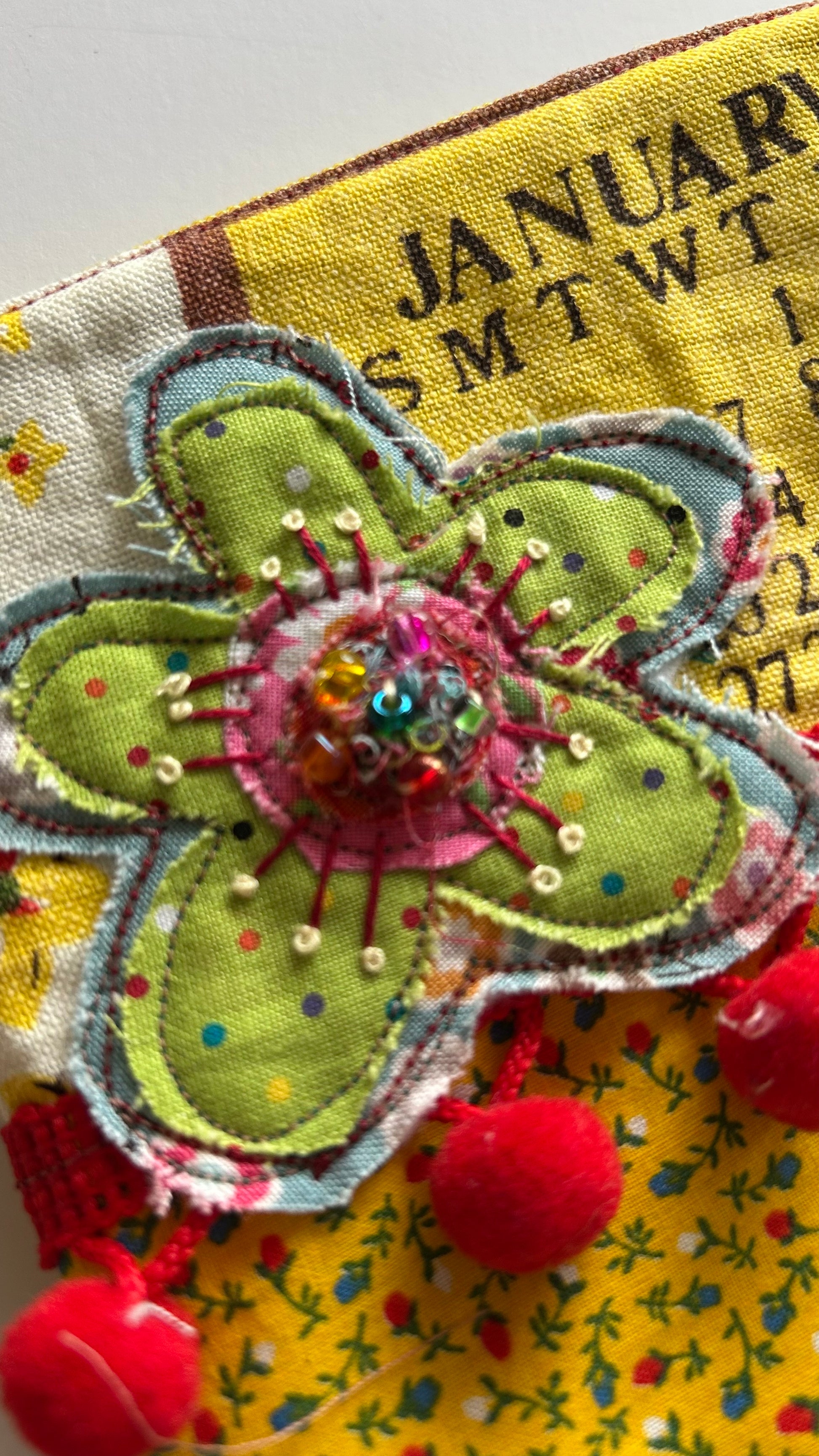 Description : This is my January zipper pouch made from a vintage 1987 linen calendar. It features the month of January on the front side, coupled with vintage yellow calico fabric from my stash, red pom-poms , and a fun blue mushroom print. The backside is the yellow calico and lime green polkadots. The zipper is yellow. It is fully lined and the same light blue mushroom fabric is inside. The front of this one features a sweet, slow stitched Daisy on the front that I created and embellished with tiny seed beads in the center, stitches,and French knots. This would make a perfect gift for someone with a birthday in January or heck treat yourself. It is a great size for organizing things in your purse or cosmetics or would even work as a pencil pouch or art pouch.Grab it today !