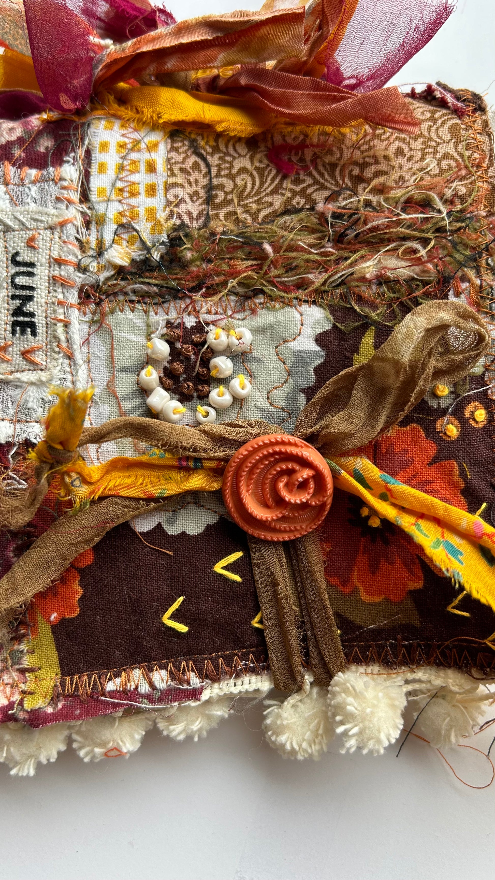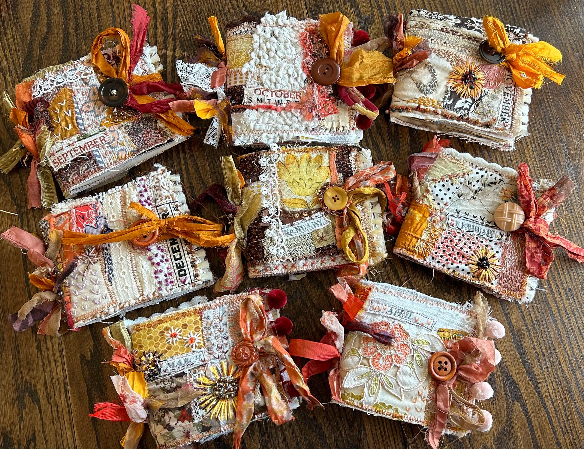 Description : These are my delightful birthday month journals. They are each approx.4x5" stitched with 25 pages inside one signature. All inside pages are in complementing color tones matching the cover and ready for your creative ideas be it journaling or art! 25 pages means 100 pgs front and back!!!! Each cover is hand stitched on the front and back sides full of sweet details. The binding is super fun sari ribbons and tiny beaded accents. Each journal is topped off with a one of a unique vintage button & sari ribbon closure. The front of each journal has a month's name featured on the cover. These are truly one of a kind creations from my hands to yours. They would make a perfect gift or treat for yourself!