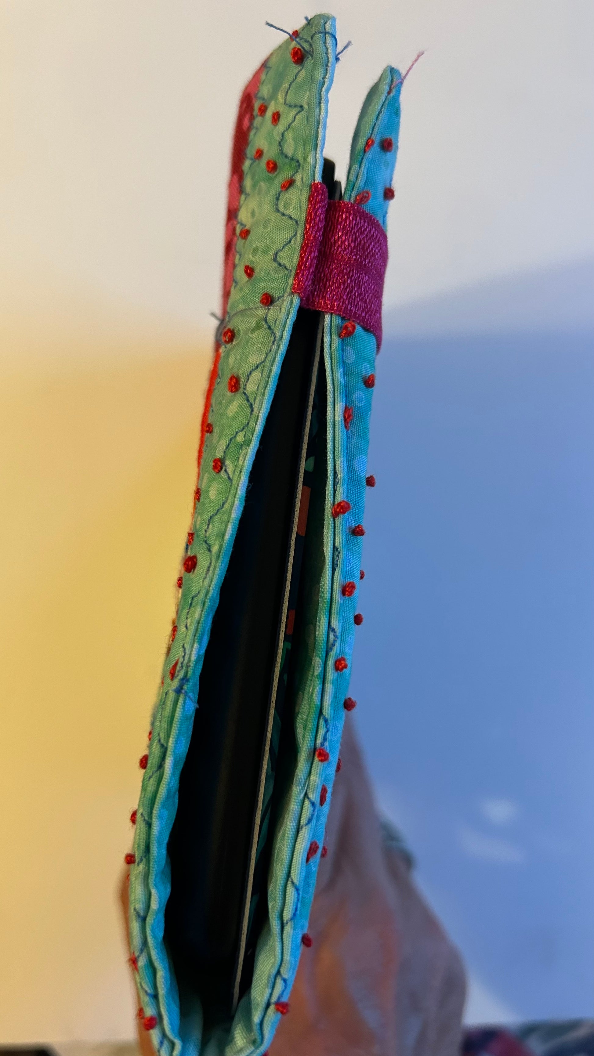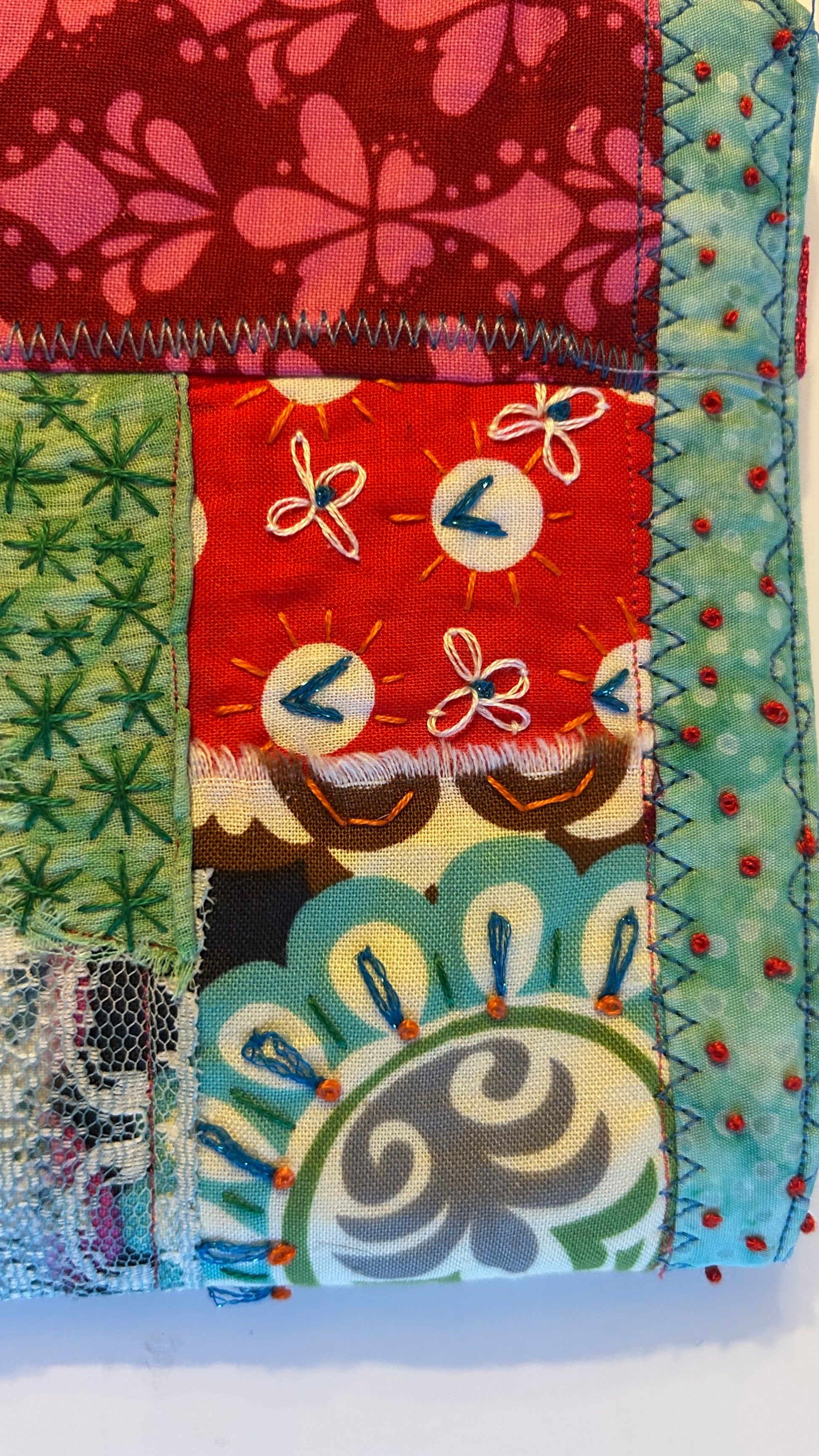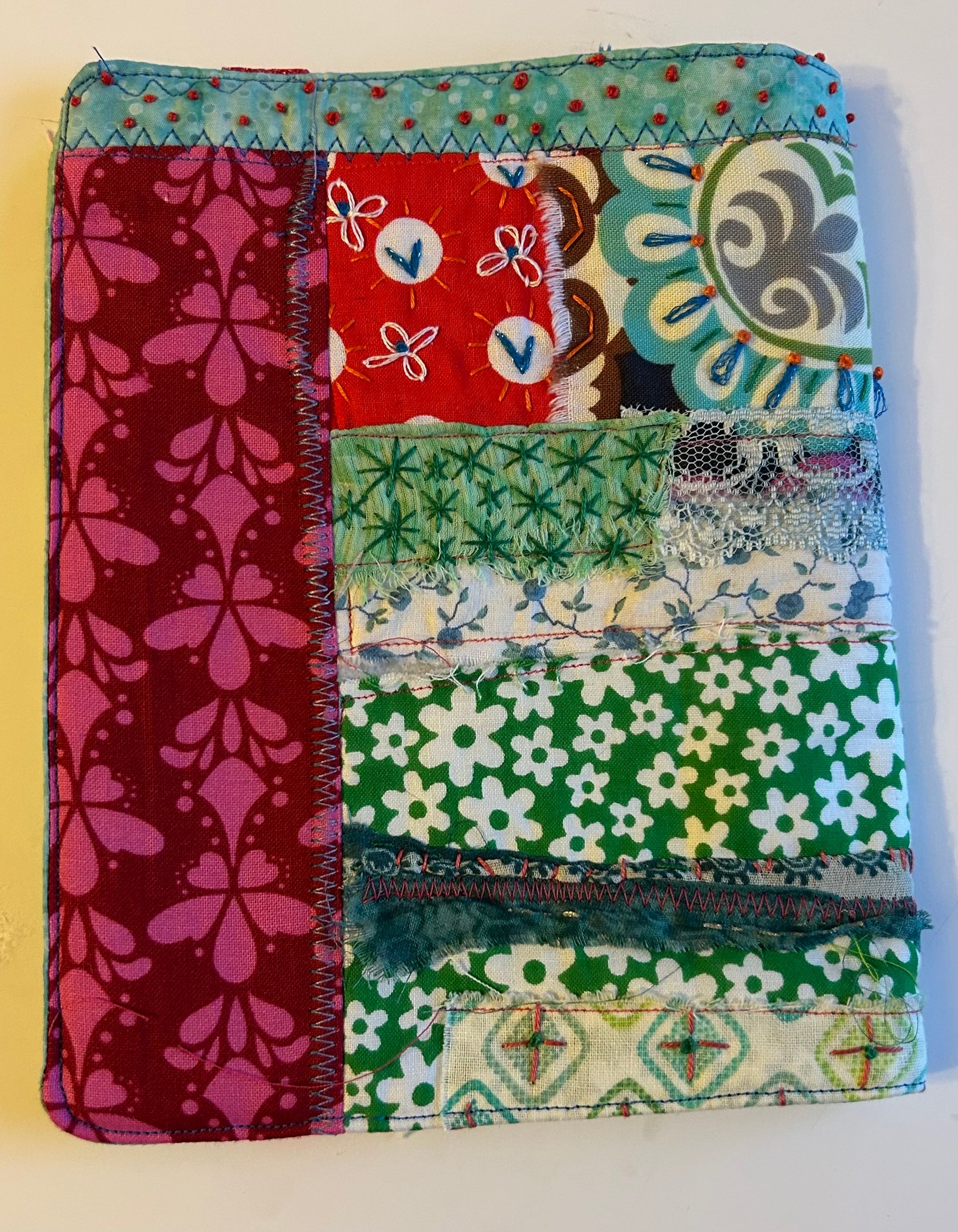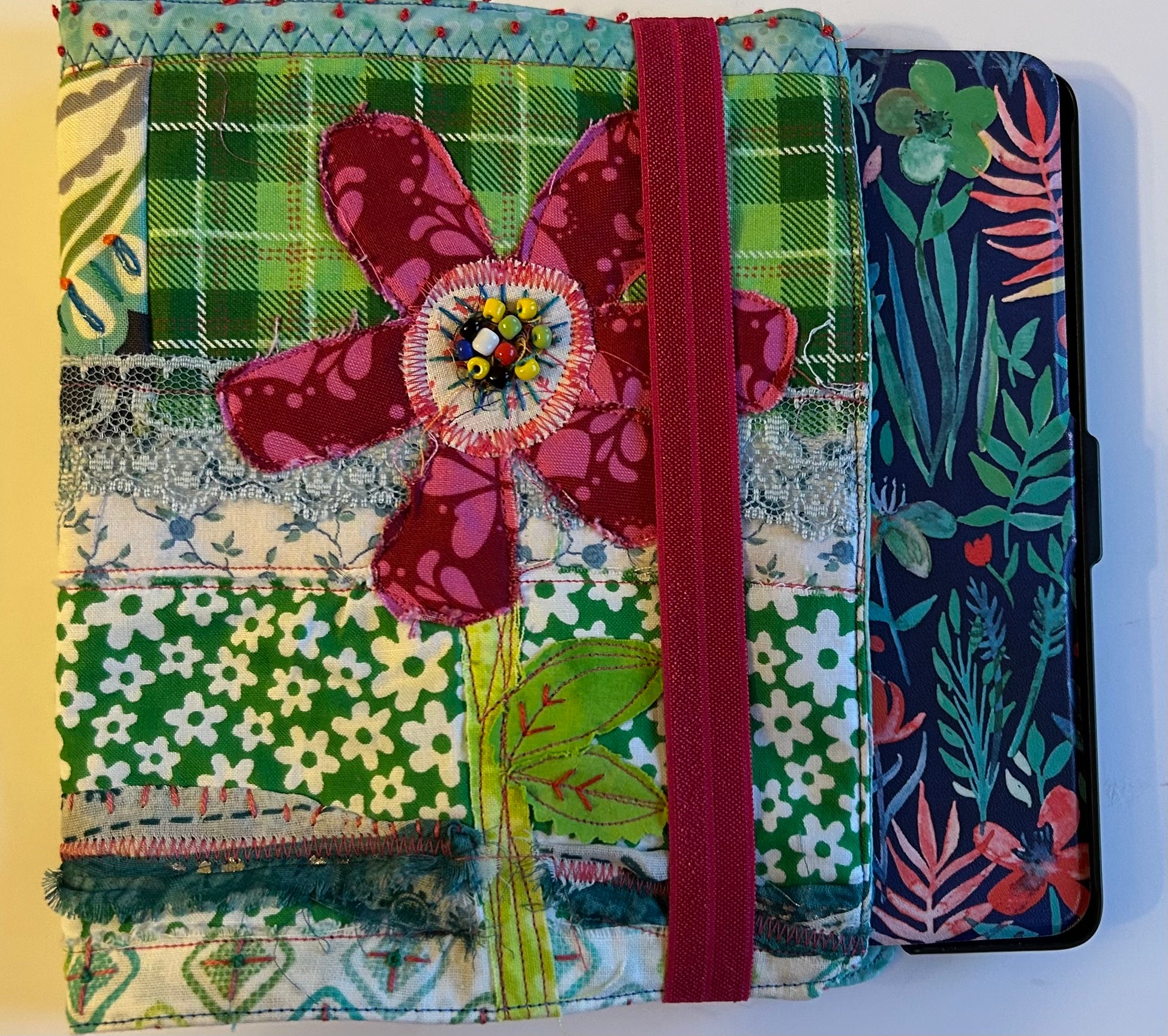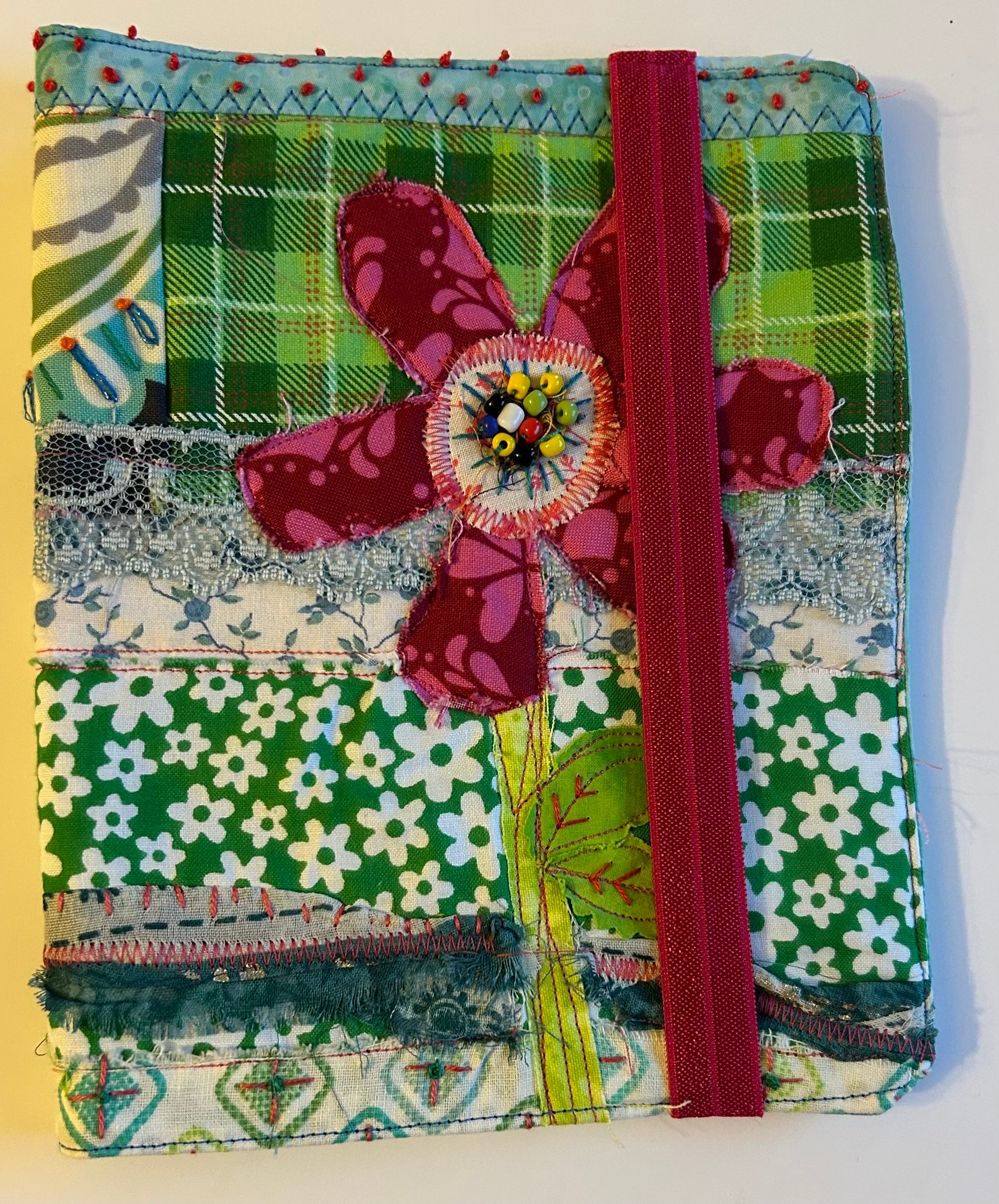 Description : This is a new line for me featuring my gorgeous textile works as book or kindle jacket wraps. This jacket is machine and slow stitched with sweet accents and bright colors of fabrics and threads from my stash. It has an elastic closure keeping your favorite read tucked nicely inside. The fun flower on the front is embellished with tiny beads. French knots & heart stitches complete this one of a kind jacket wraps. Make it yours today & wrap up your favorite book or kindle case & make what you’re reading that much more enjoyable and pretty too! Make sure to measure you book or kindle first to ensure a perfect fit. This jacket is approx 6.25”x7.5”