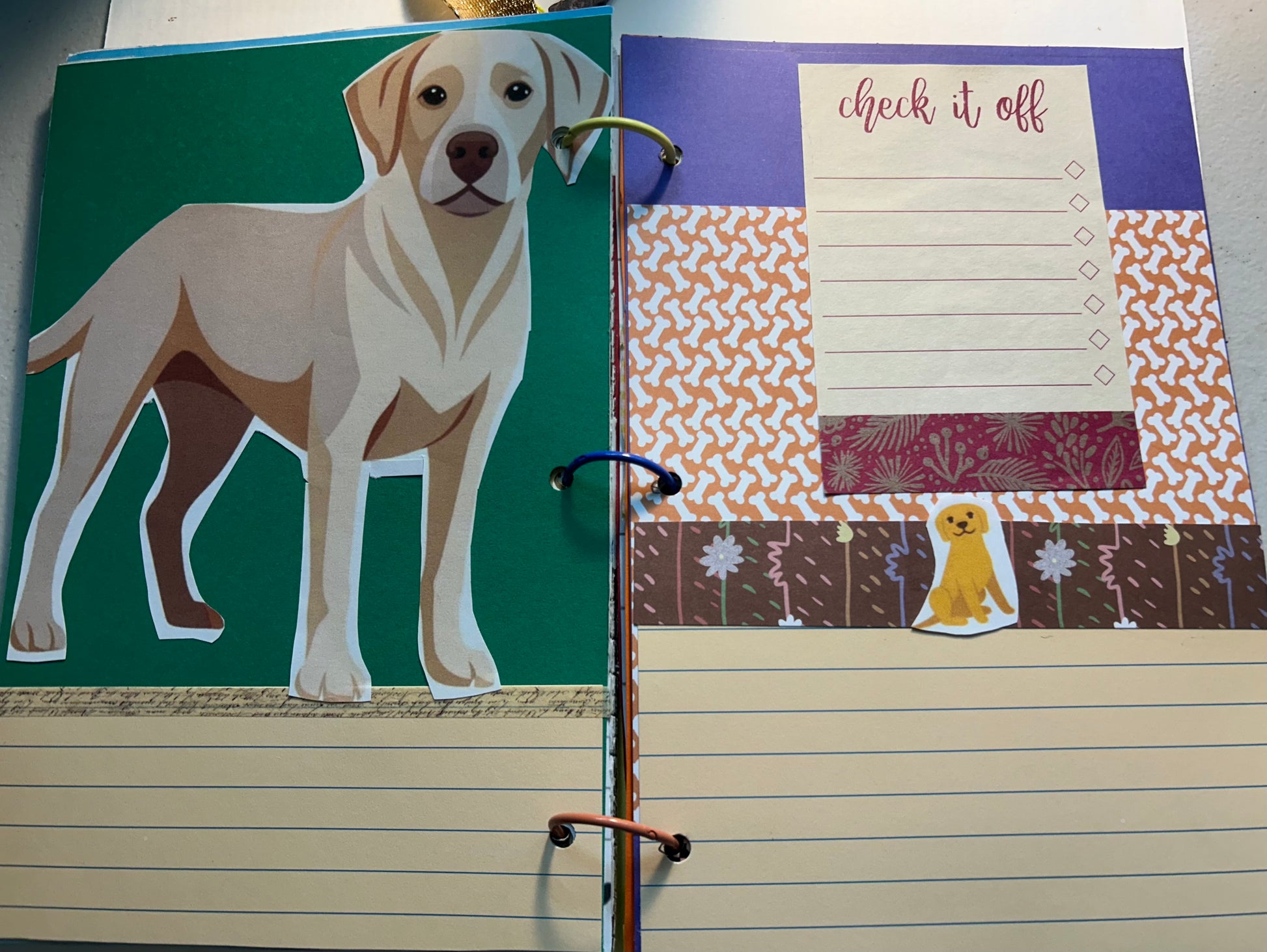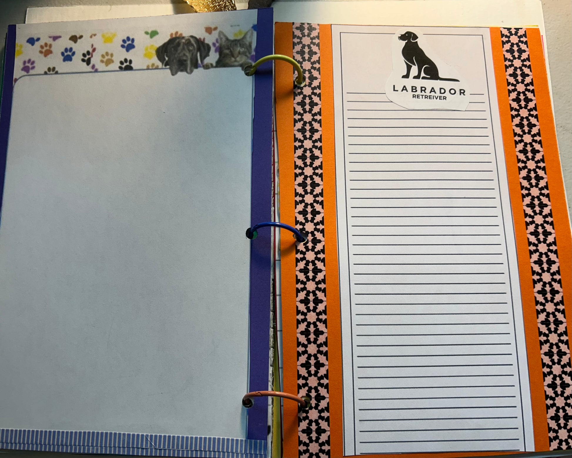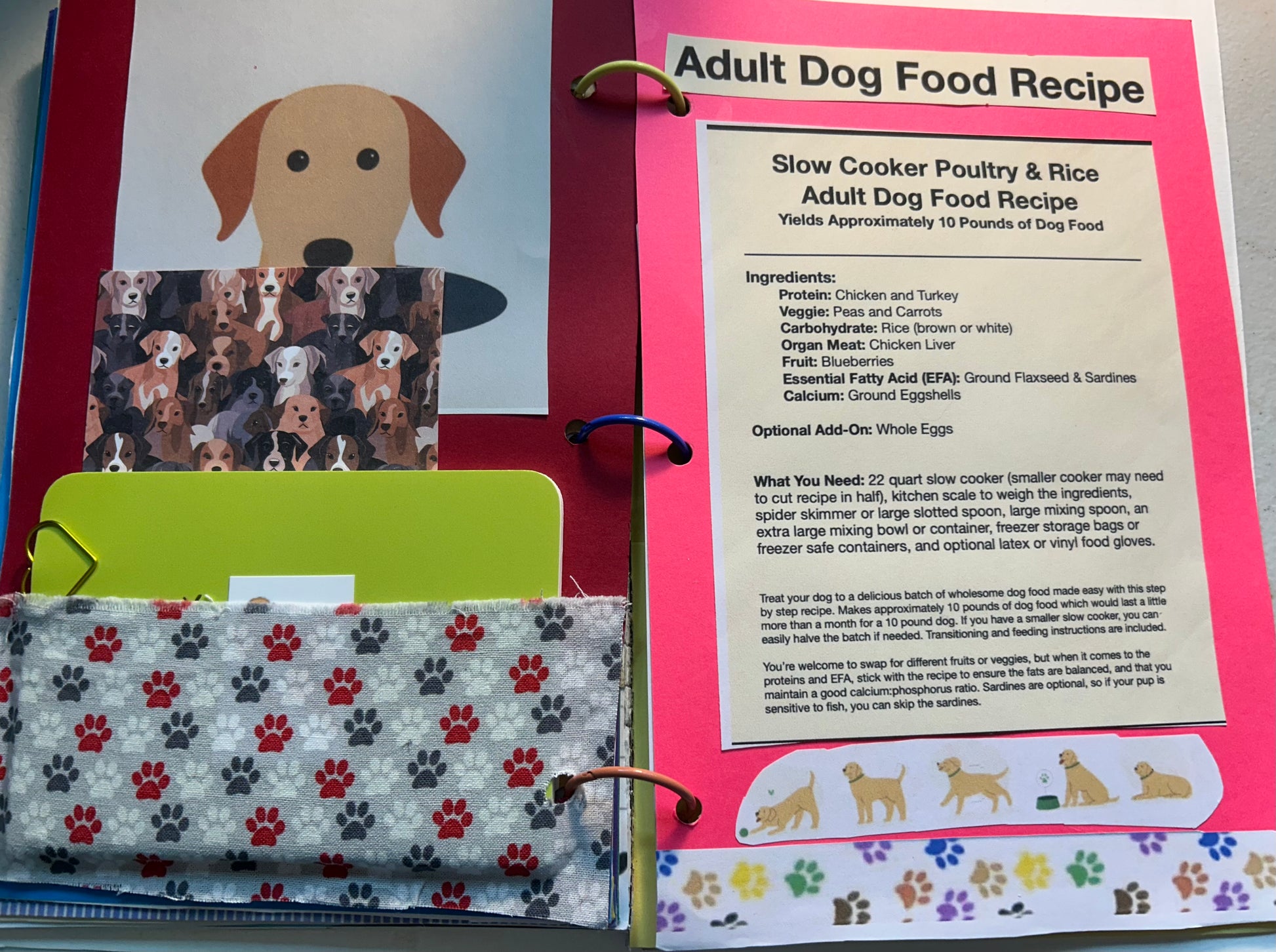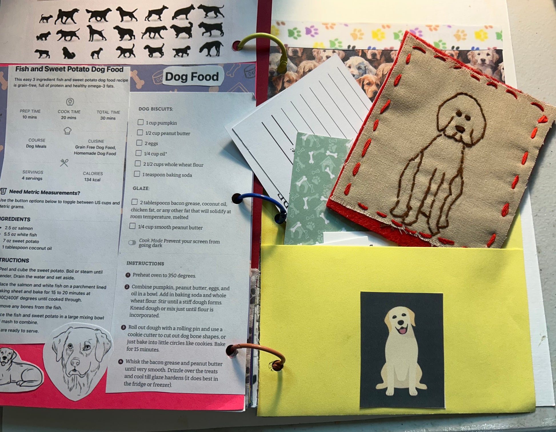 Description : Marley & Me was an adult story about a family and their dog. It was also made into a movie. This 2005 book is adapted for children. The book is repurposed and has the complete story. It is also a handmade journal that is collaged. There is a small notebook, slow stitched picture and three recipes for making dog food. This journal is perfect for a dog lover!
