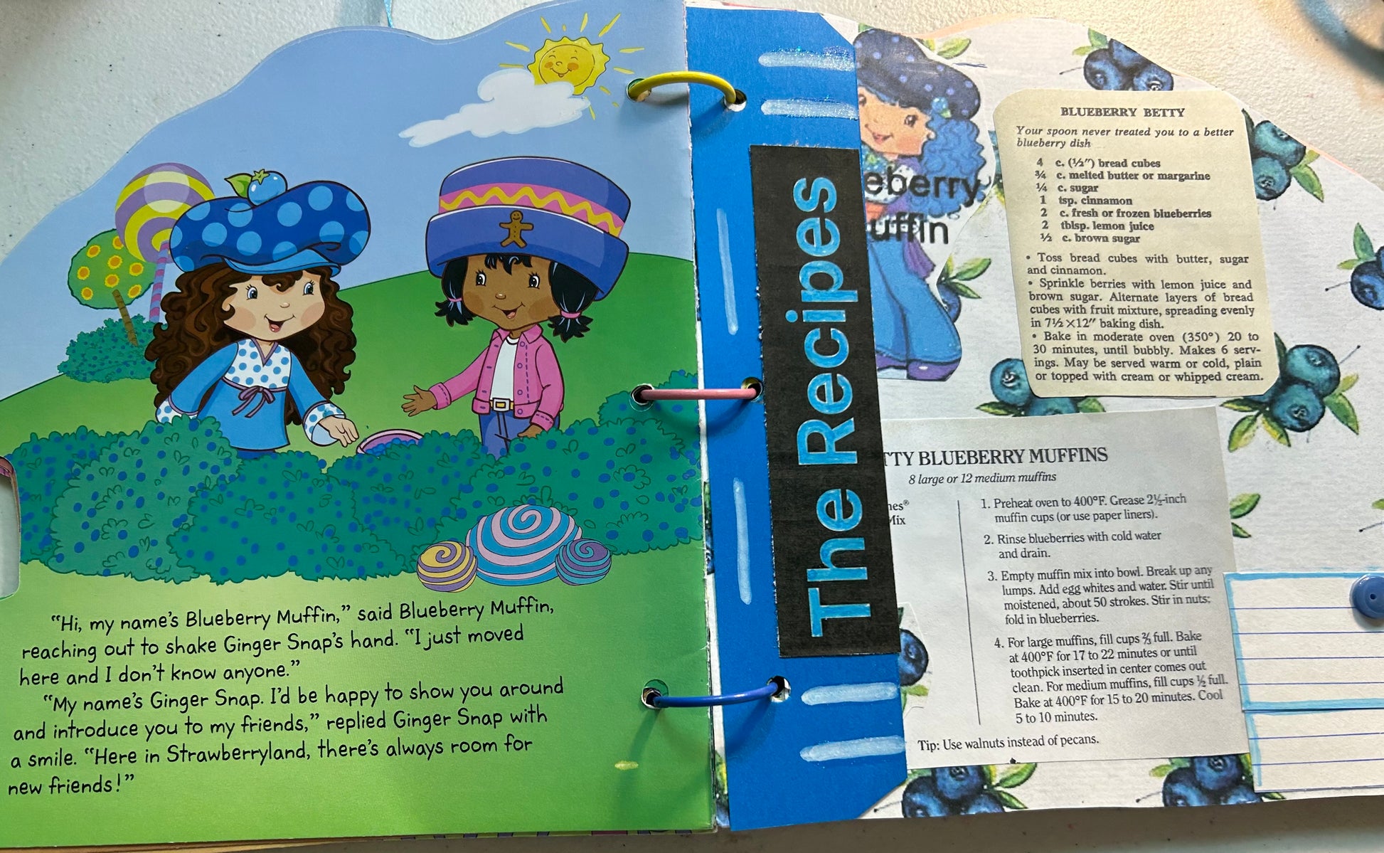Description : Meet Blueberry Muffin is a recycled children’s book. (2004) It has been repurposed into a story, journal and recipe book. The story is intact with the other pages collaged. The book is about friendship and problem solving. I researched recipes for all of the fruity characters. This book is perfect for you or a special friend. Add Blueberry Muffin and her pals to your group of friends!