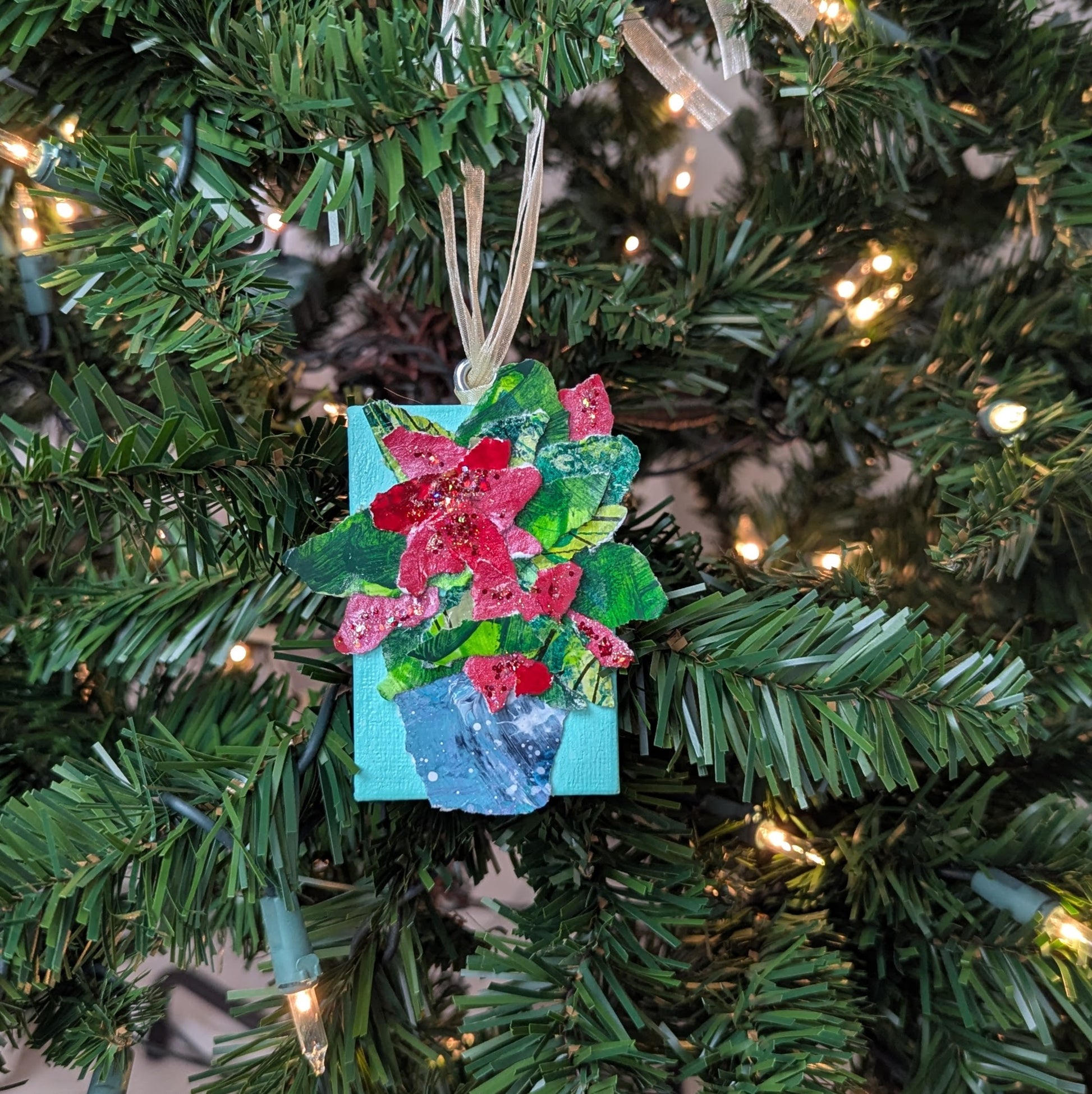 Description : This tiny collage on a mini painted canvas makes a cute tree ornament with festive red flowers and lots of greenery. Created from tiny torn pieces of watercolor paper, previously painted with acrylic paint, the flowers and leaves form a slightly dimensional arrangement. A pretty ribbon for hanging and a finished back complete the ornament which is sealed with a gloss sealer. This item is for the vase shown in the first photo, but there are six different ones available, see photos.