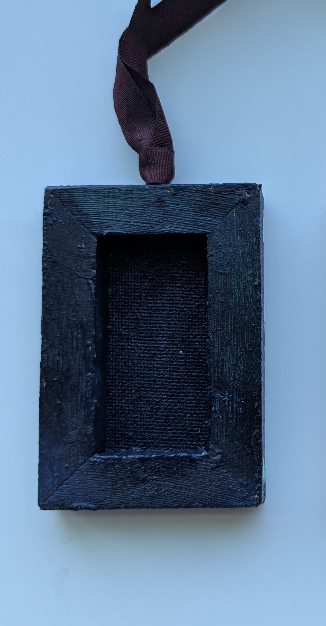 Description : This mini canvas has great texture and many tiny flecks of colors on the tiny painted tree. It looks adorable hanging on a Christmas tree by the pretty ribbon and the back is finished in case it is seen. The canvas is finished with a gloss sealer which helps it shine under the tree lights.
