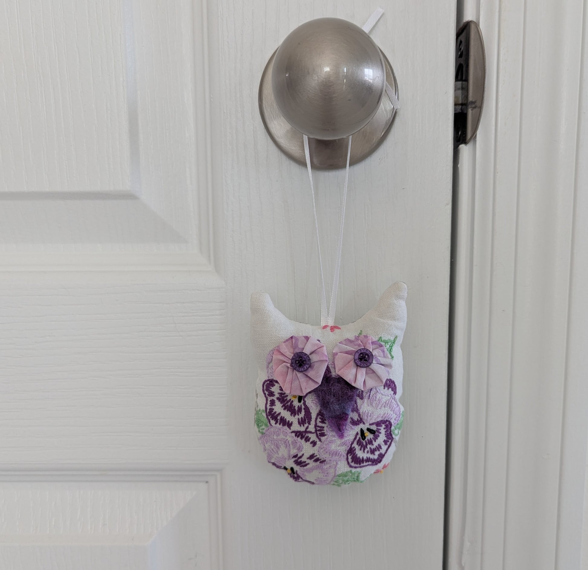 Description : This friendly little owl looks so cute hanging on a door handle. His body is just under 4” tall and hangs on knotted 7” long narrow white ribbons. He is made from vintage embroidered linen with purple pansies on back and front. The big eyes are made from yo-yos and small buttons hand stitched together and his beak is a handmade felted wool snippet. The body parts are machine stitched together and stuffed with new Poly-fil stuffing.