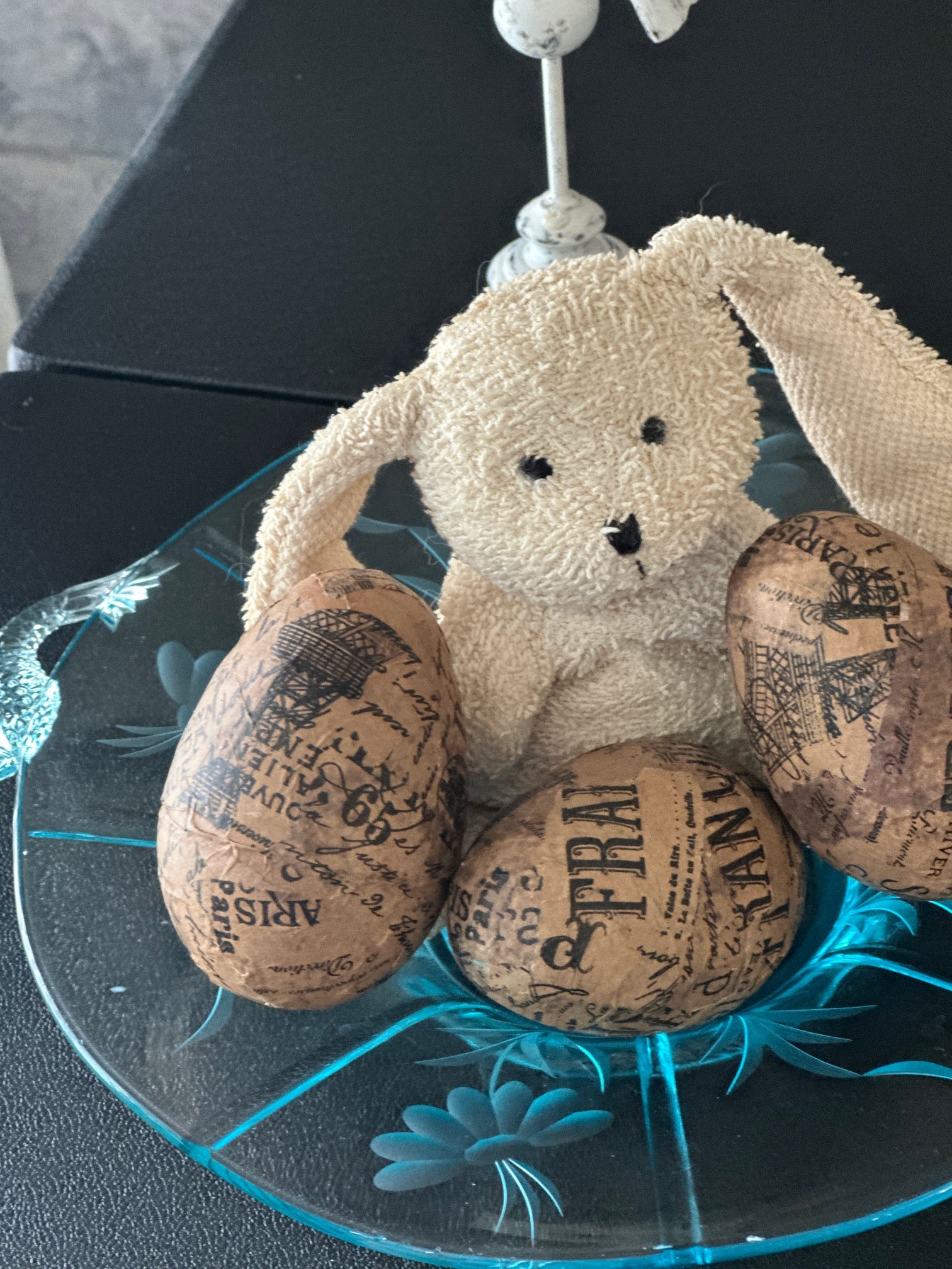 Description : 3 papier mache/decoupage Easter eggs - Covered with Vintage French Script paper. Black print on brown background. Handmade. Handcrafted. A very unique decor item.