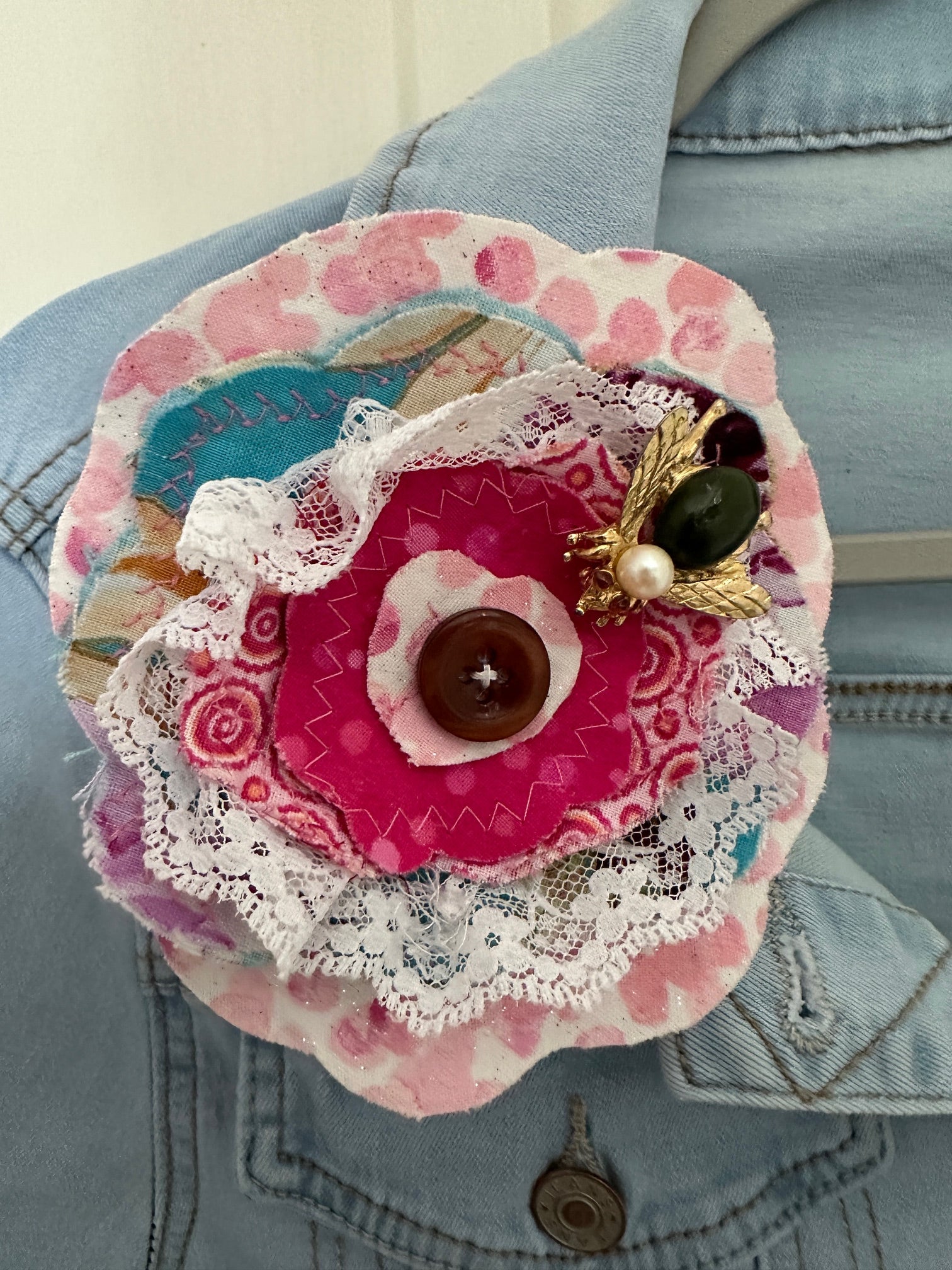Description : Handcrafted with stitched pink fabric with lace and bee jewel embellishment, this brooch is perfect for accenting your outfits. Beautiful addition to a jacket, sweater, or dress or attach to a dress. Pin on back. 4.5 inch diameter. A great gift item.