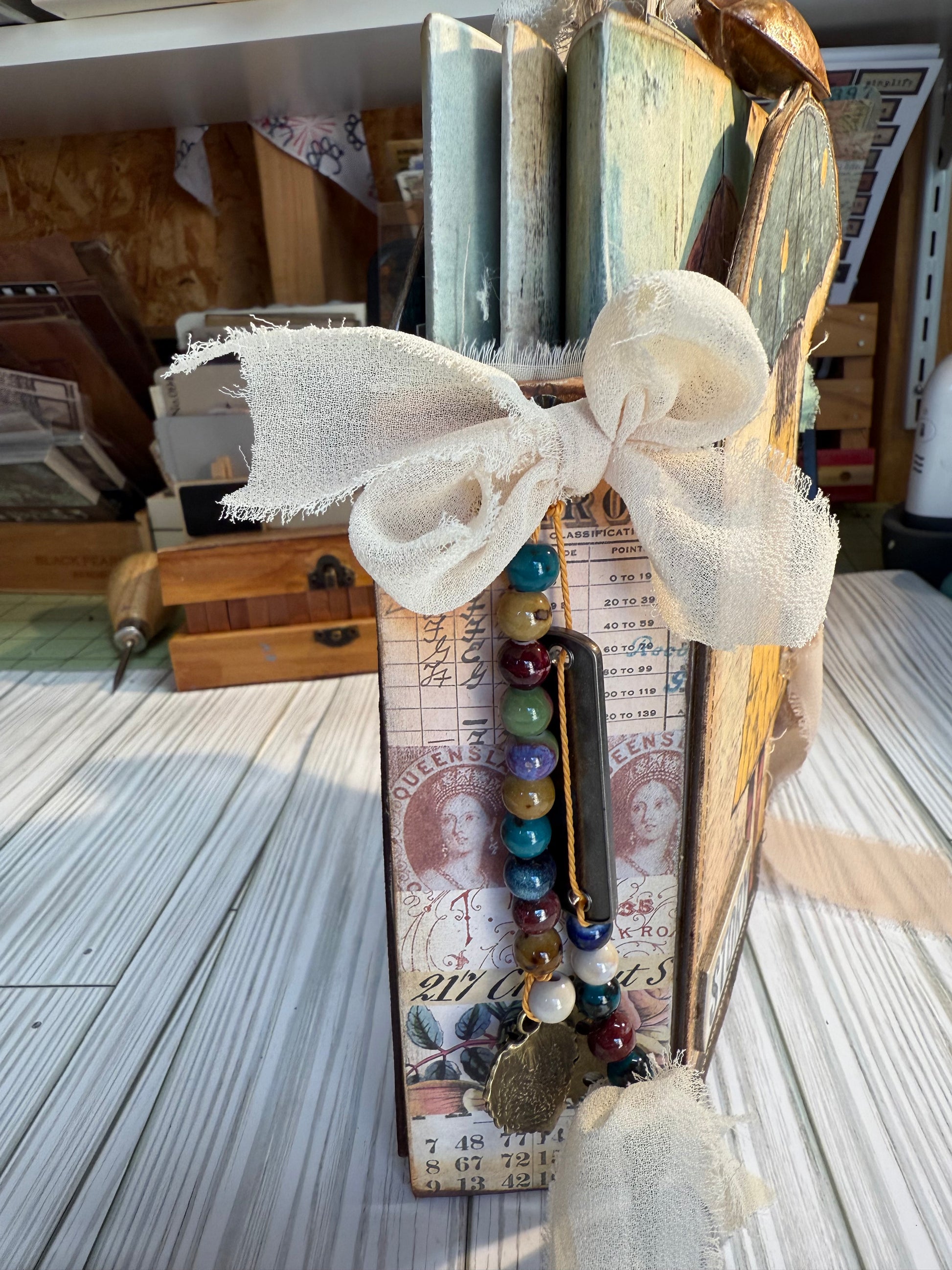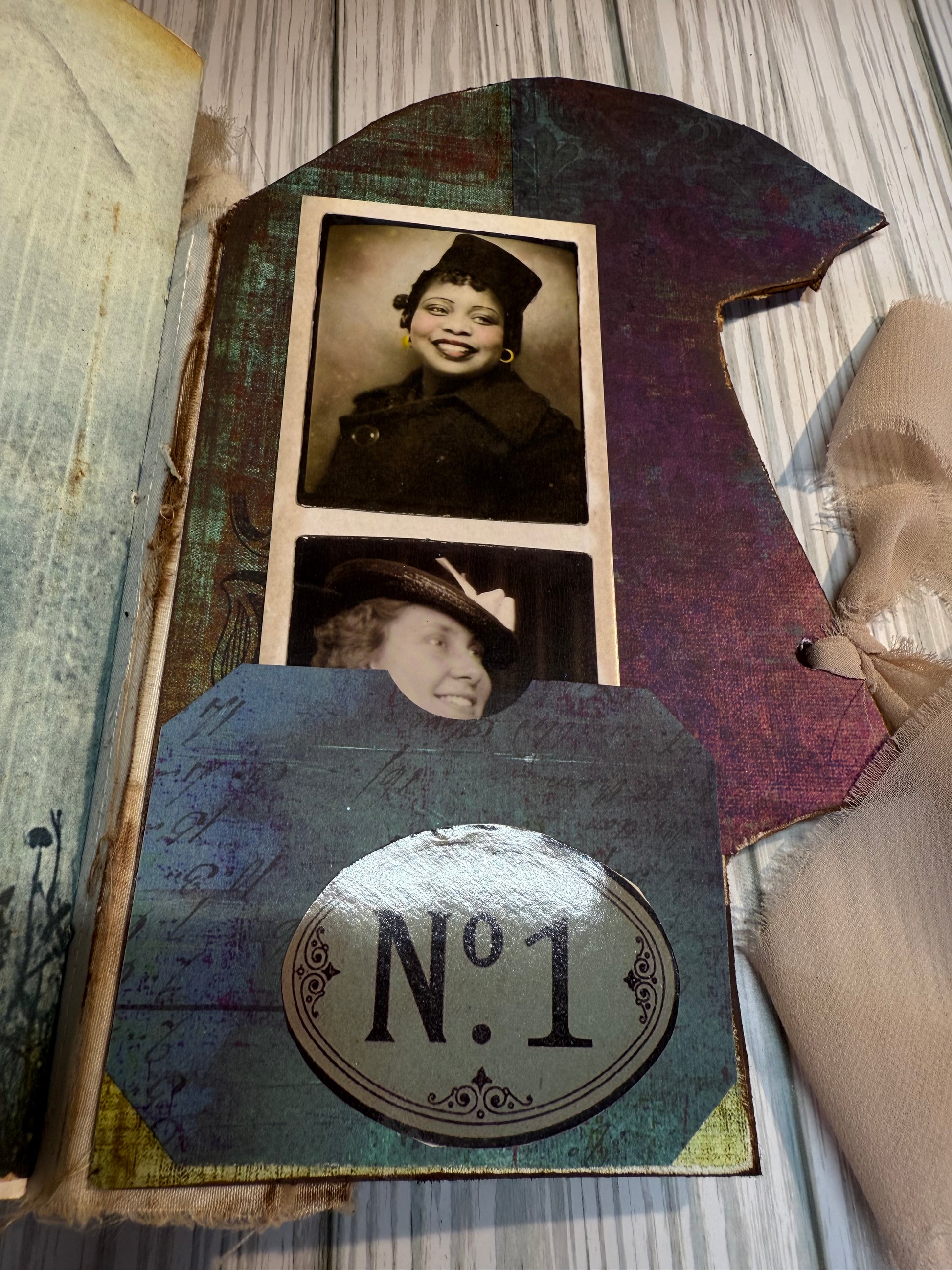 Description : One of a kind journal full with vintage ephemera. Filled with all types of tucks and pockets stuffed with vintage paper. There are 3 signatures and over 50 pages of journaling space.