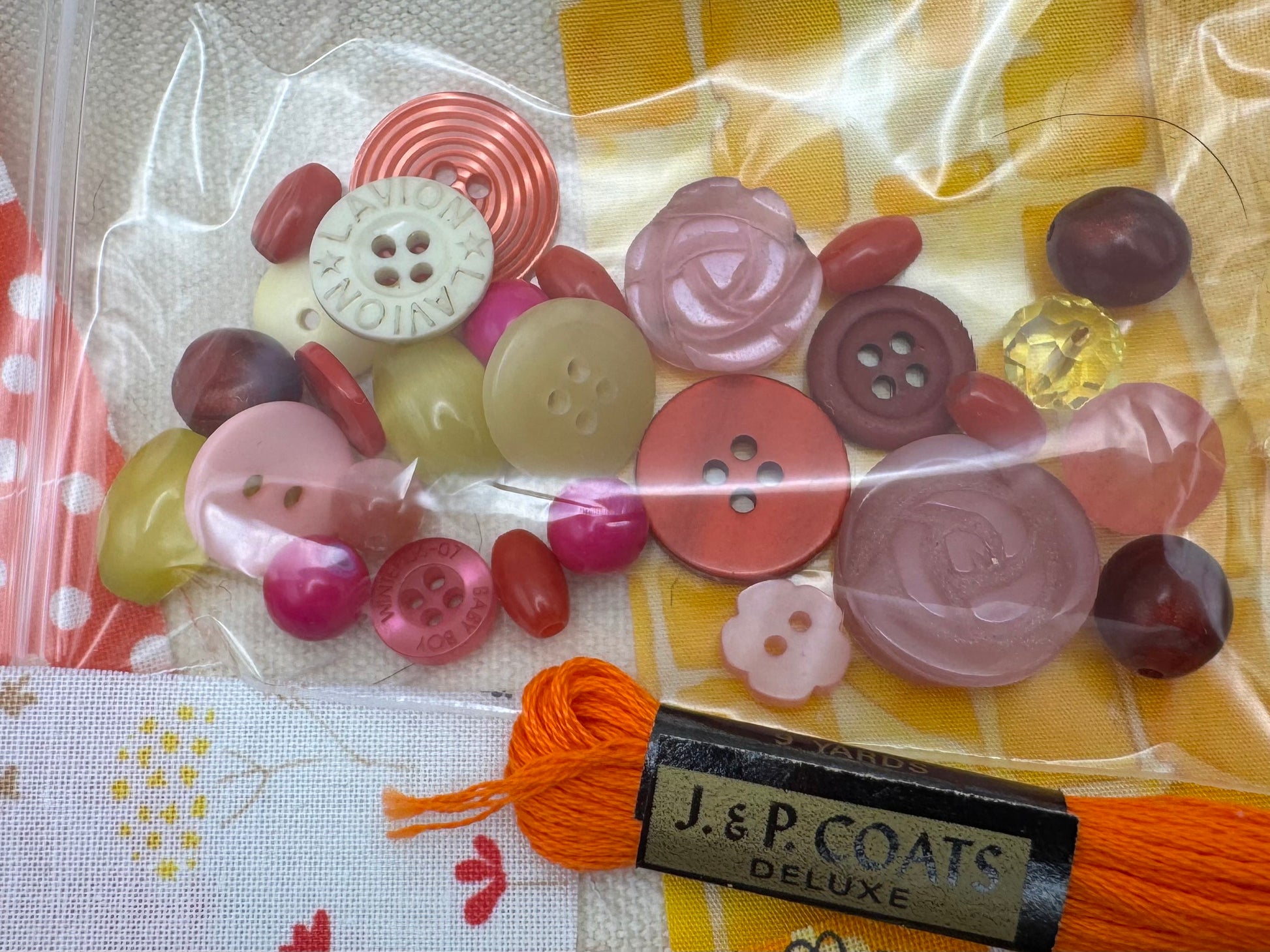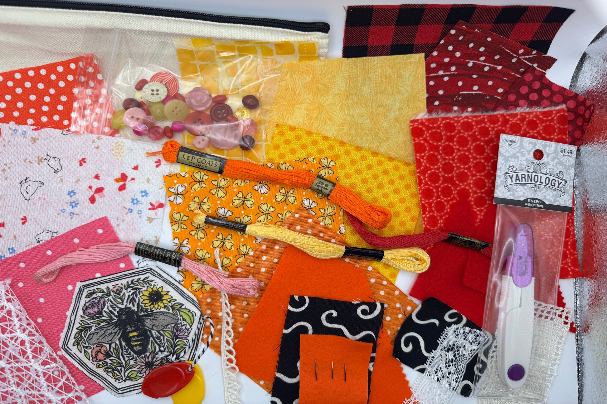 Description : Slow Stitch Kit with everything you need to get started slow stitching. This kit is the yellow/orange/pink/red kit which includes: * orange, pink, yellow, and red embroidery thread skeins * three embroidery needles * two needle threaders * one pair of scissors * 14 pieces of fabric and 3 pieces of felt * 4 pieces of lace * over 25 matching beads and buttons * one fabric cosmetic case you can store your supplies in and take with you and you can also use as a slow stitch canvas! Great gift for your crafty friend or y for yourself to have a travel slow stitch kit! Includes a bee design on fabric to use for any fabric project!