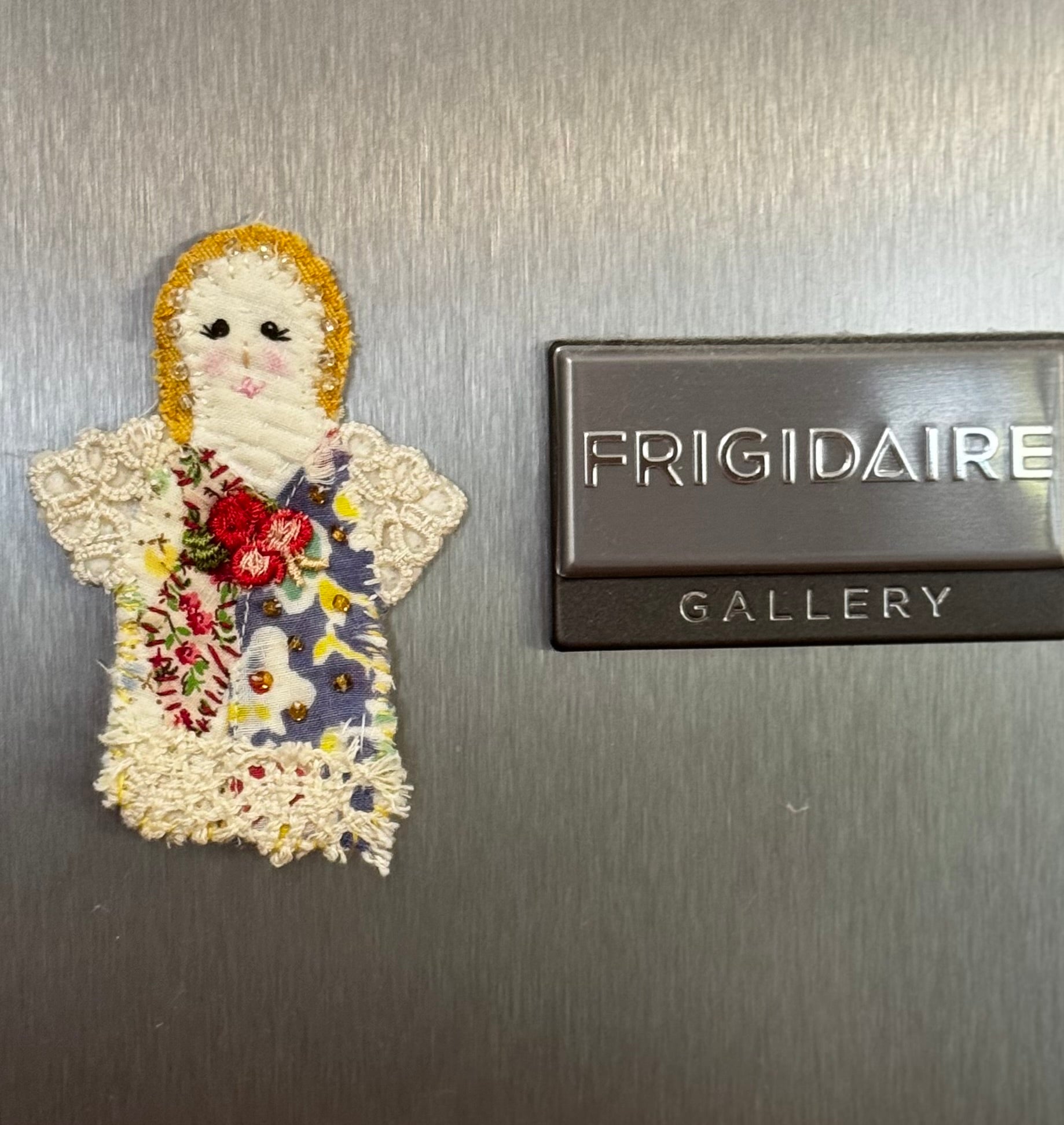 Description : Slow stitched with an old quilt, antique material and lace. Embellished with DMC embroidery floss. This angel can be used for a journal cover, use to embellish a name tag, as a decoration on a gift, glue a magnet to the back and display on your refrigerator or use a safety pin and attach to your clothing. This listing is for the angel only, everything else are props.