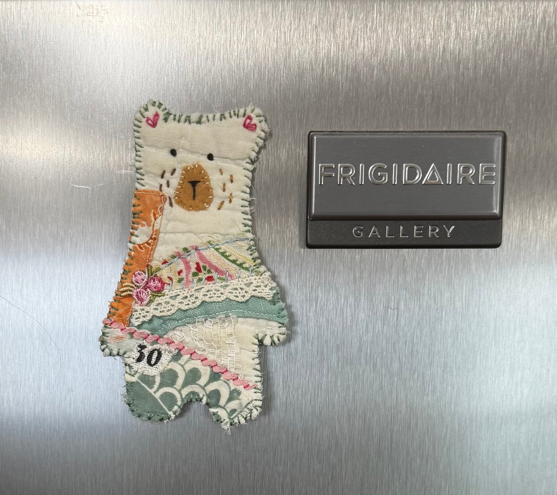 Description : Slow stitched with an old quilt, antique material and lace. Embellished with DMC embroidery floss. This bear can be used for a journal cover, use to embellish a name tag, as a decoration on a gift, glue a magnet to the back and display on your refrigerator or use a safety pin and attach to your clothing. This listing is for the bear only, everything else are props.