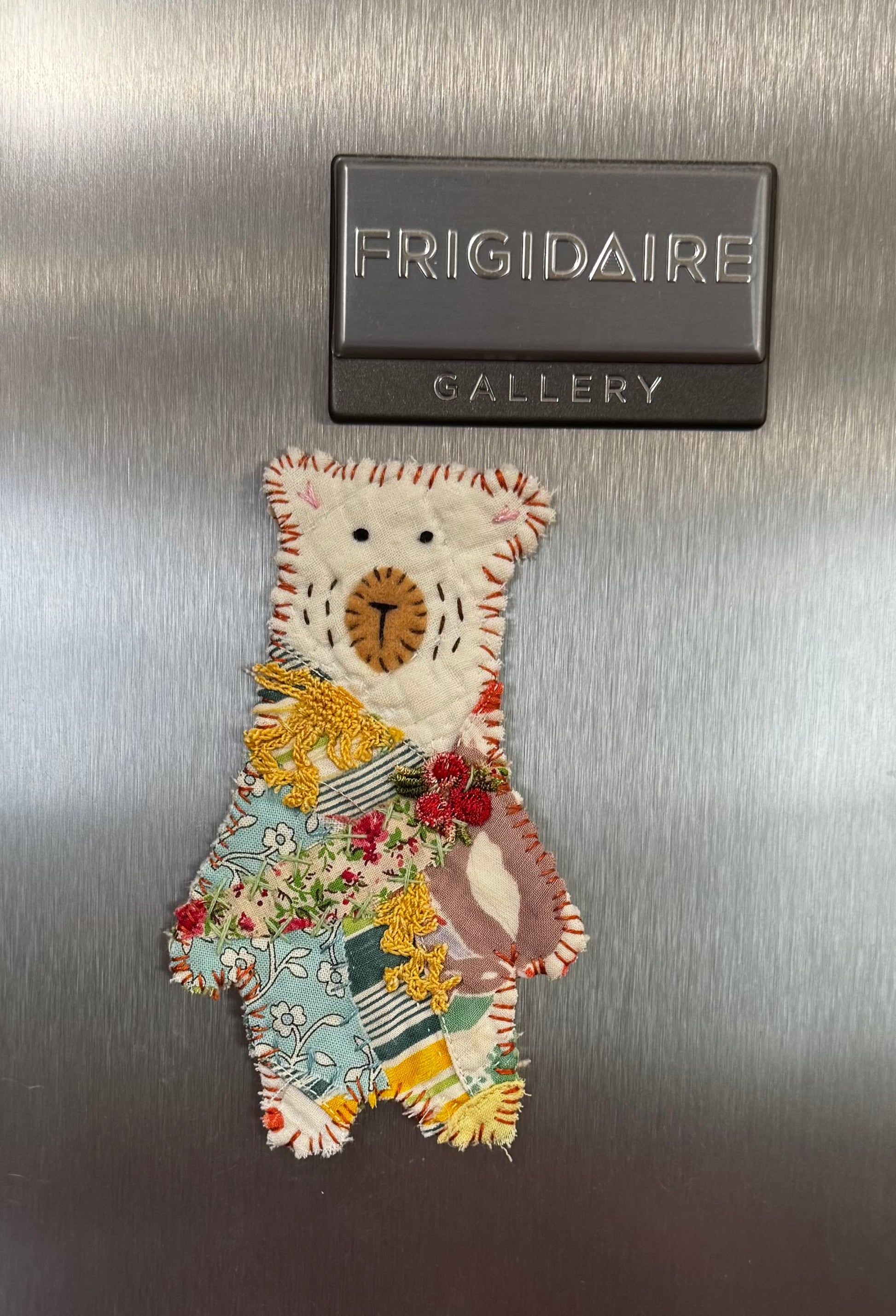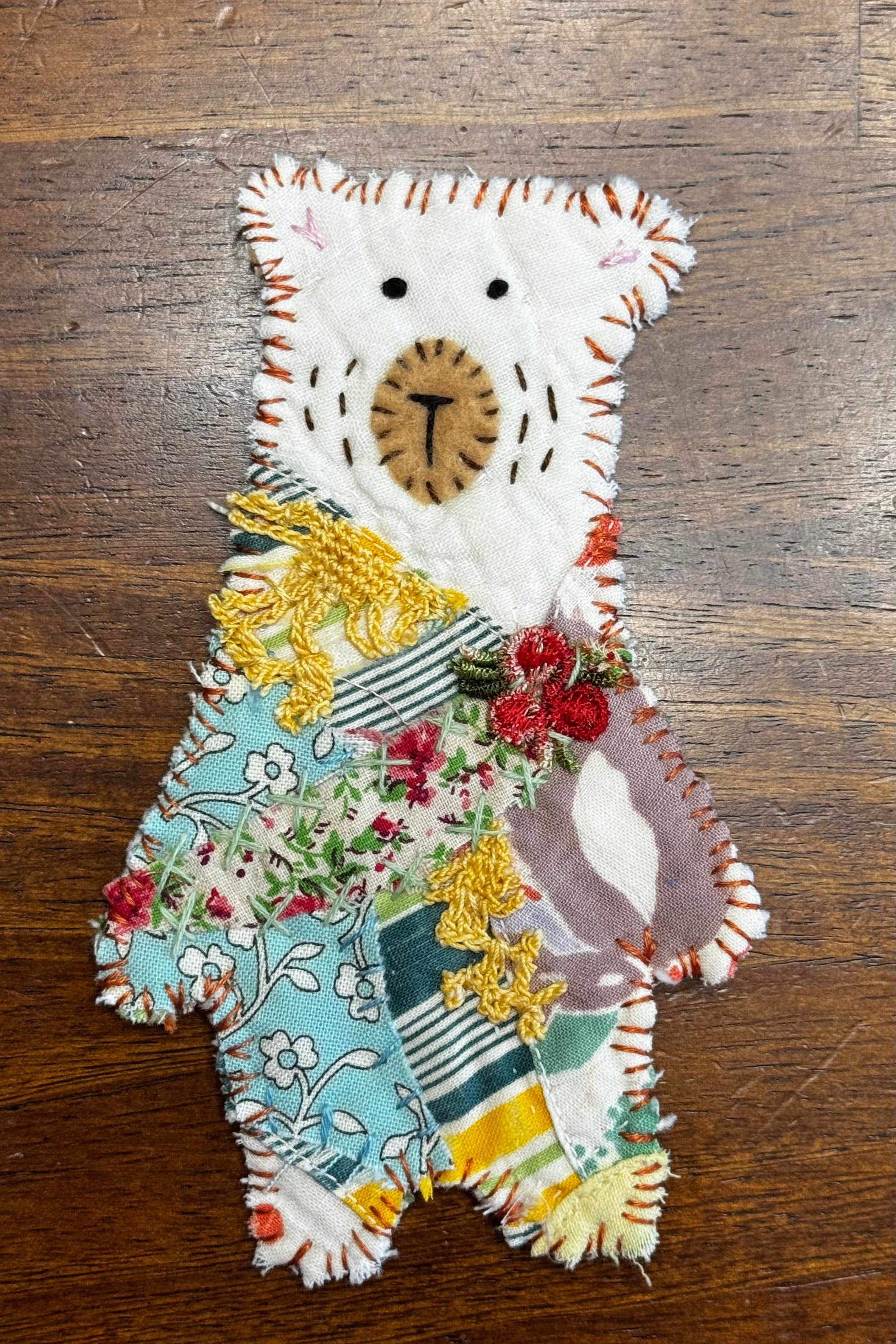 Description : Slow stitched with an old quilt, antique material and lace. Embellished with DMC embroidery floss. The back of the bear is an old tea dyed embroidered doily. This bear can be used for a journal cover, use to embellish a name tag, as a decoration on a gift, glue a magnet to the back and display on your refrigerator or use a safety pin and attach to your clothing. This listing is for the bear only, everything else are props.