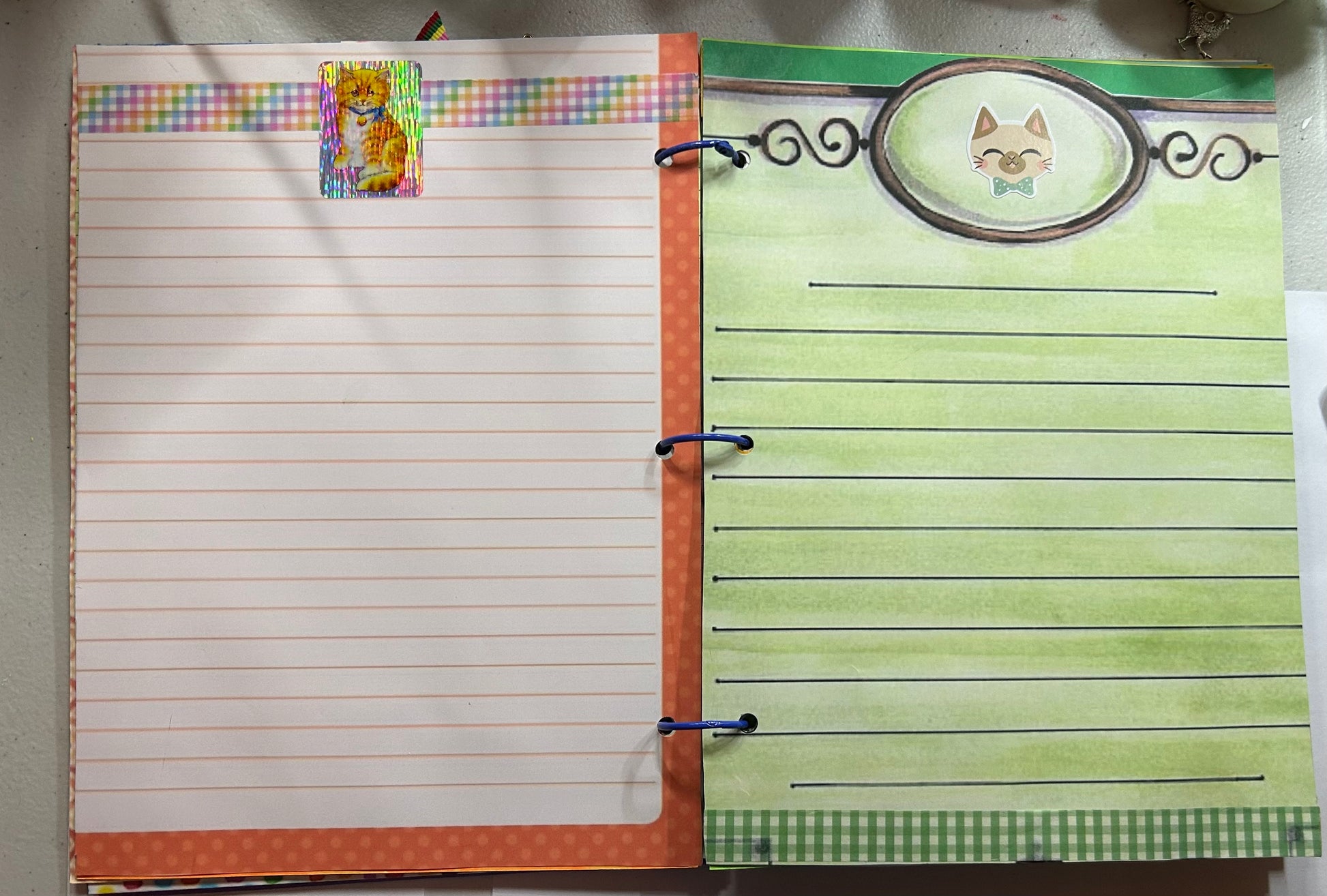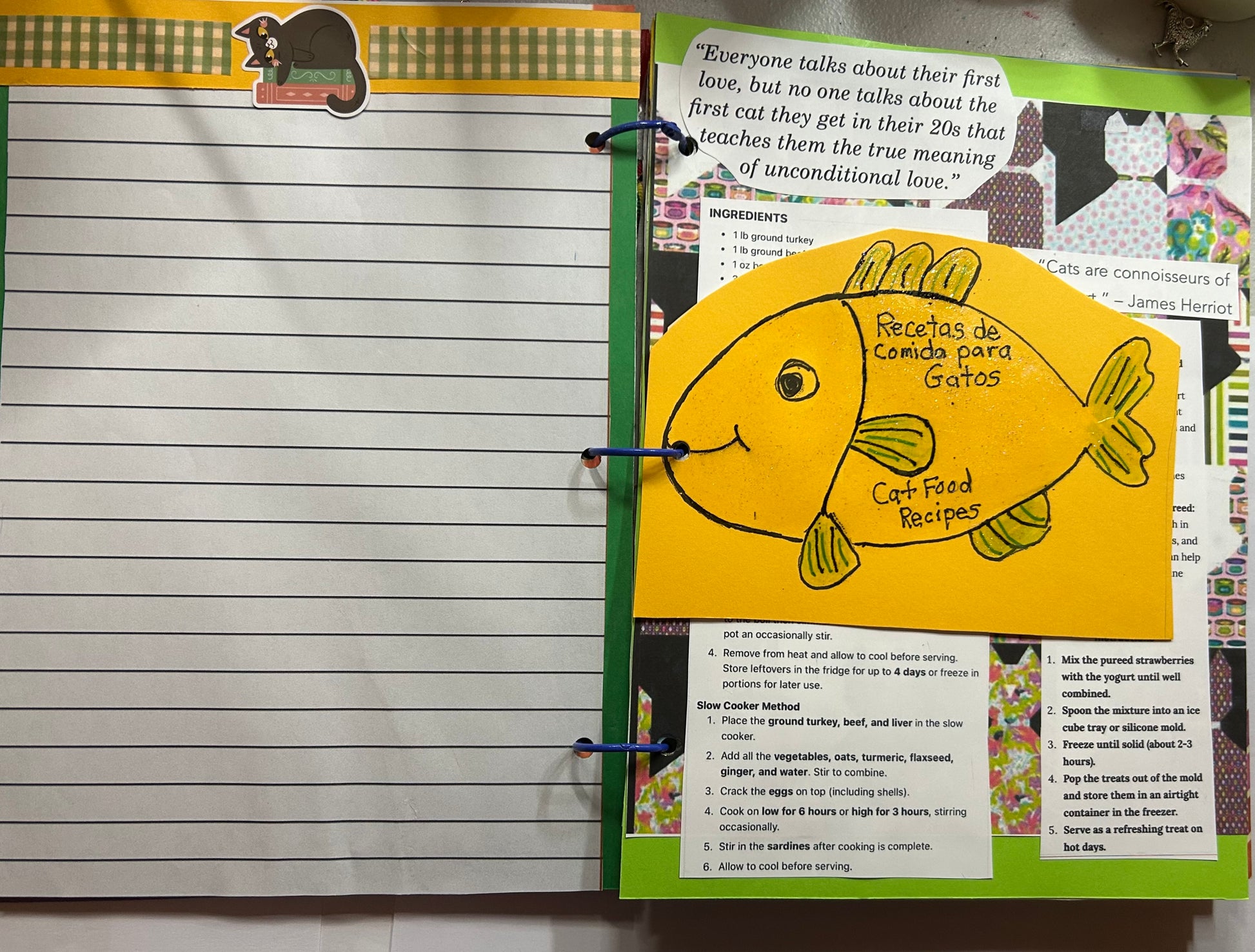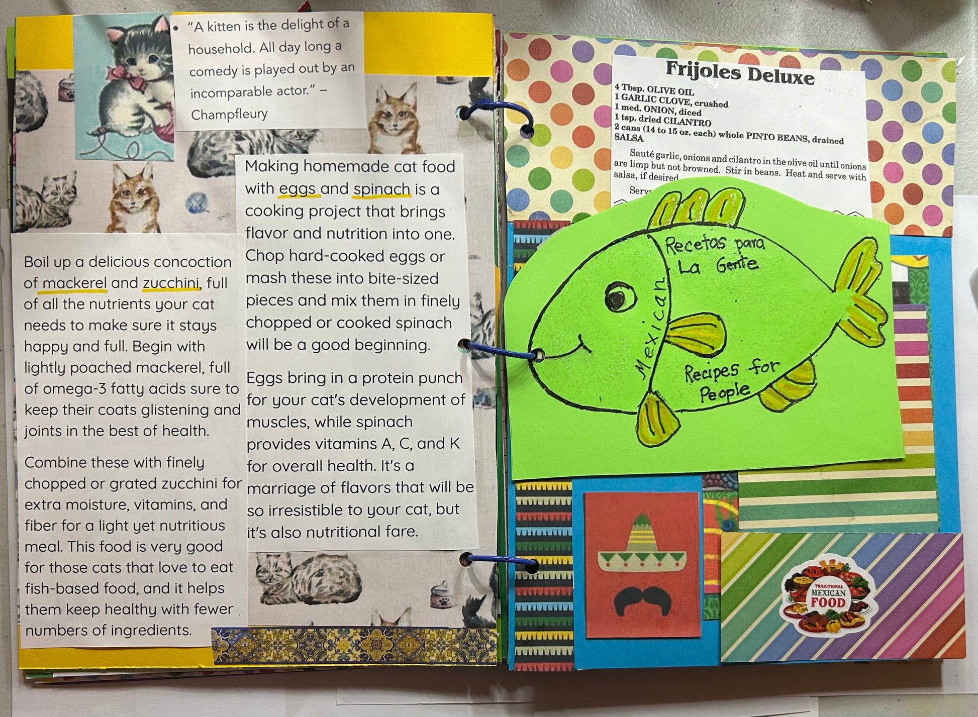 Description : The Mischievous Kitty Cat is a bilingual short story, journal and recipes for you and your cat. Pages are collaged with plenty of journaling spaces. There are 12 recipes for cats and 14 for people. The people food is Mexican. There is also a bit of ephemera and surprises! Come on Cat Ladies get the perfect book for yourself!