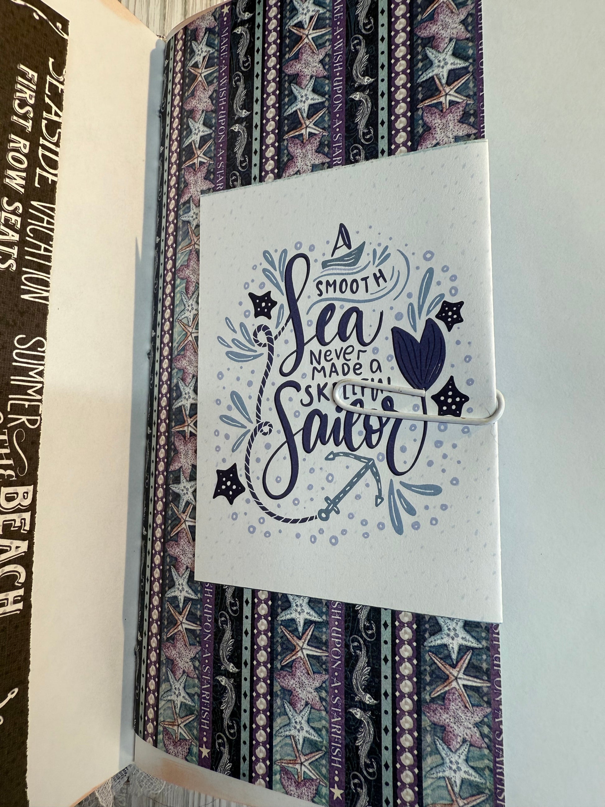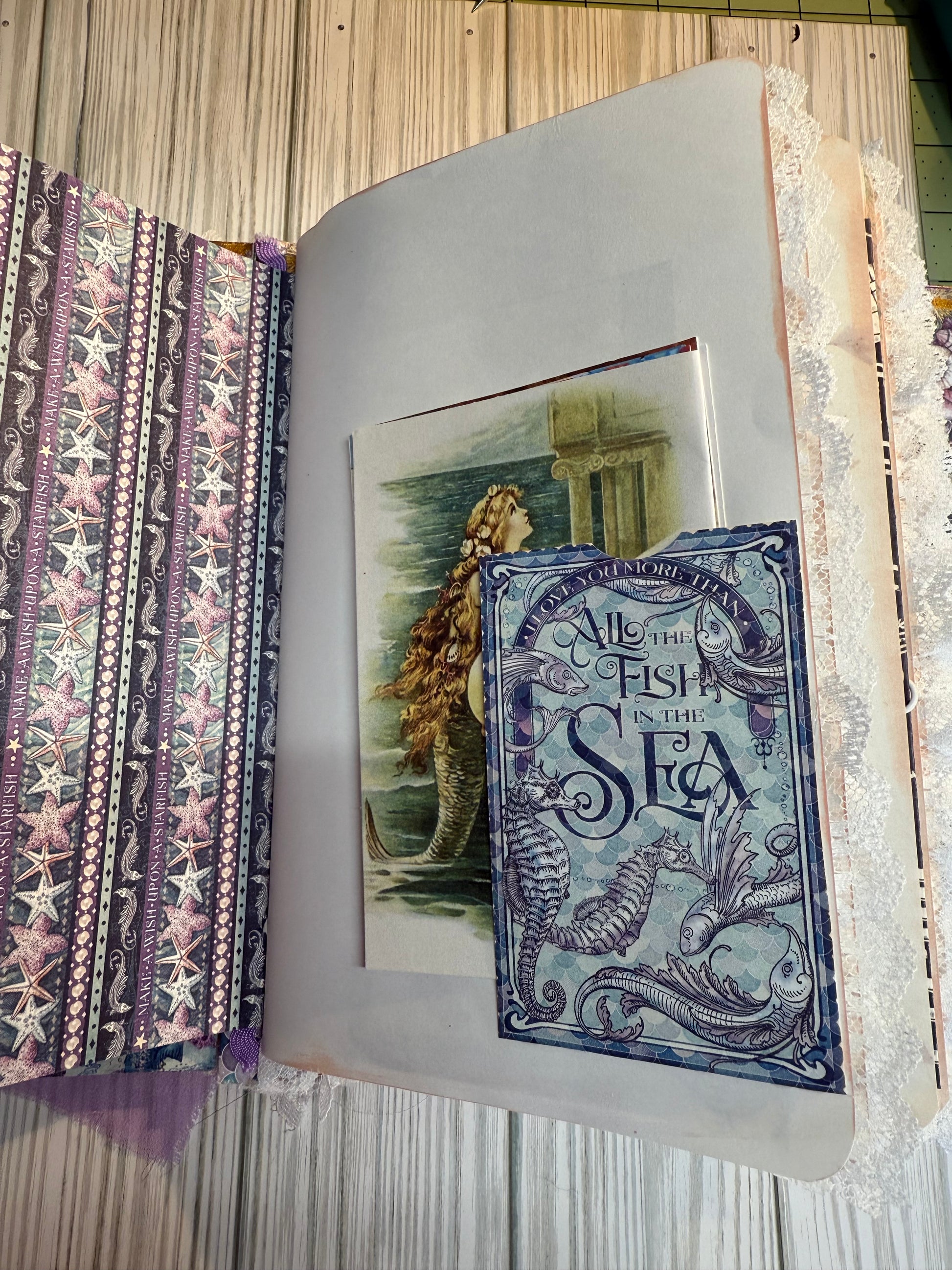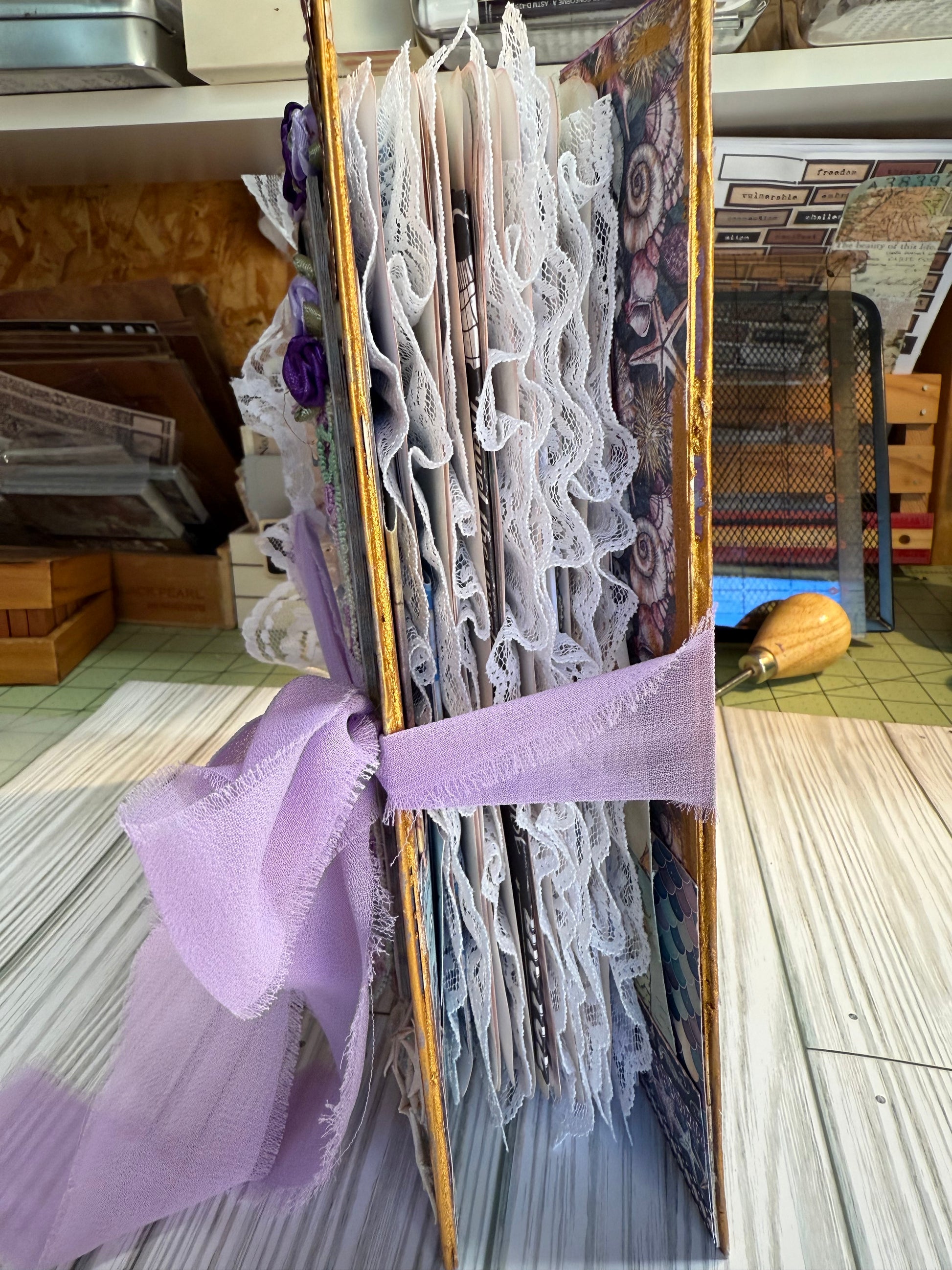 Description : This journal is full of vintage paper handmade paper. There are three signatures with over 50 page of journaling space would make a great gift or a special place for pictures. The front includes Vintage tatting that I got at the garage sale. It’s just beautiful purple and lime green. The book is hand bound and the gold accents around the edge. Give it that special look
